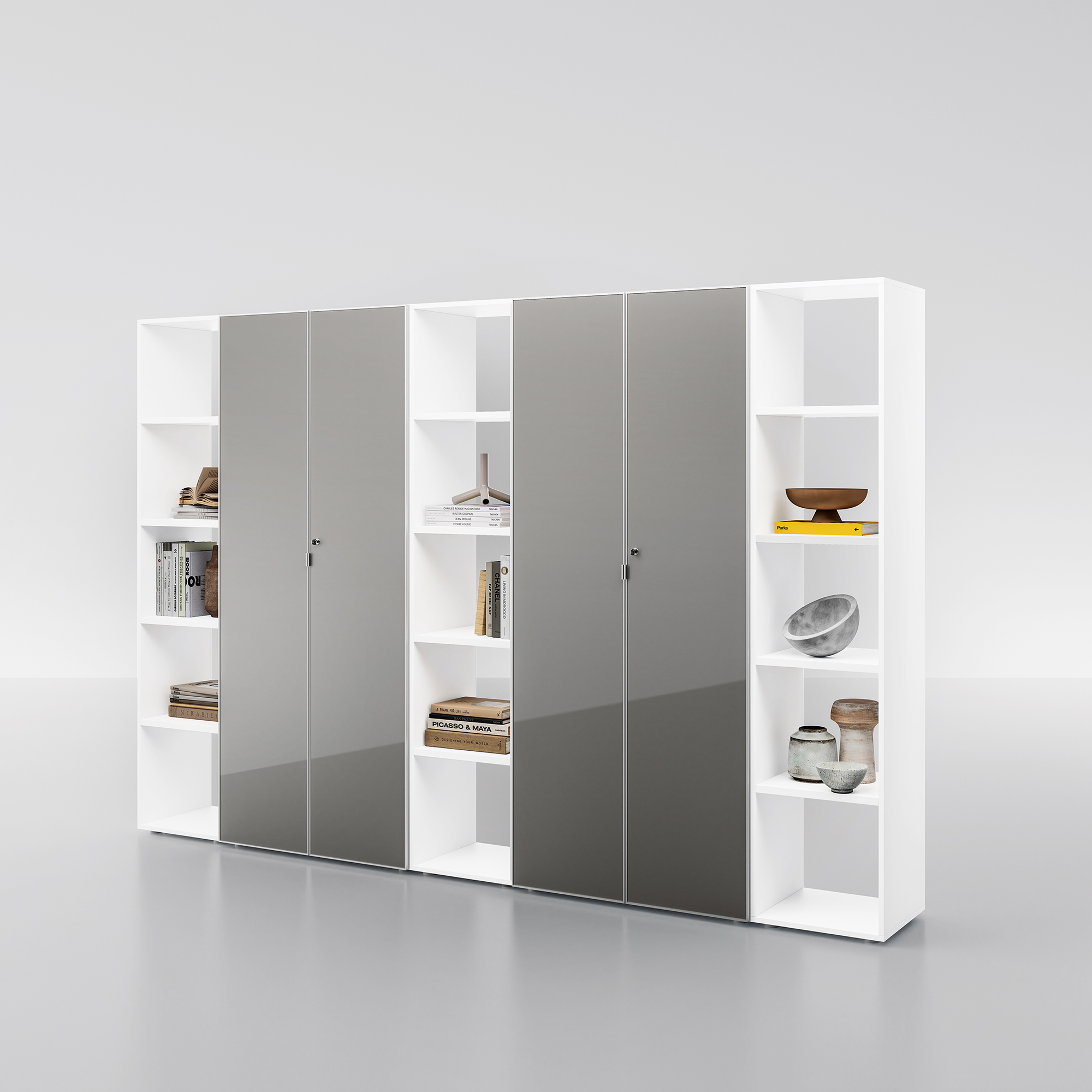 Elegante e versatile, la libreria in legno si caratterizza per la sua modularità che offre vani chiusi con schienale, ante ed elementi a giorno, consentendo uno sviluppo longitudinale potenzialmente senza limiti. Ampia la selezione di finiture per le ante.