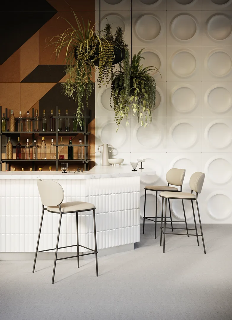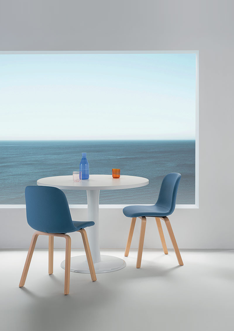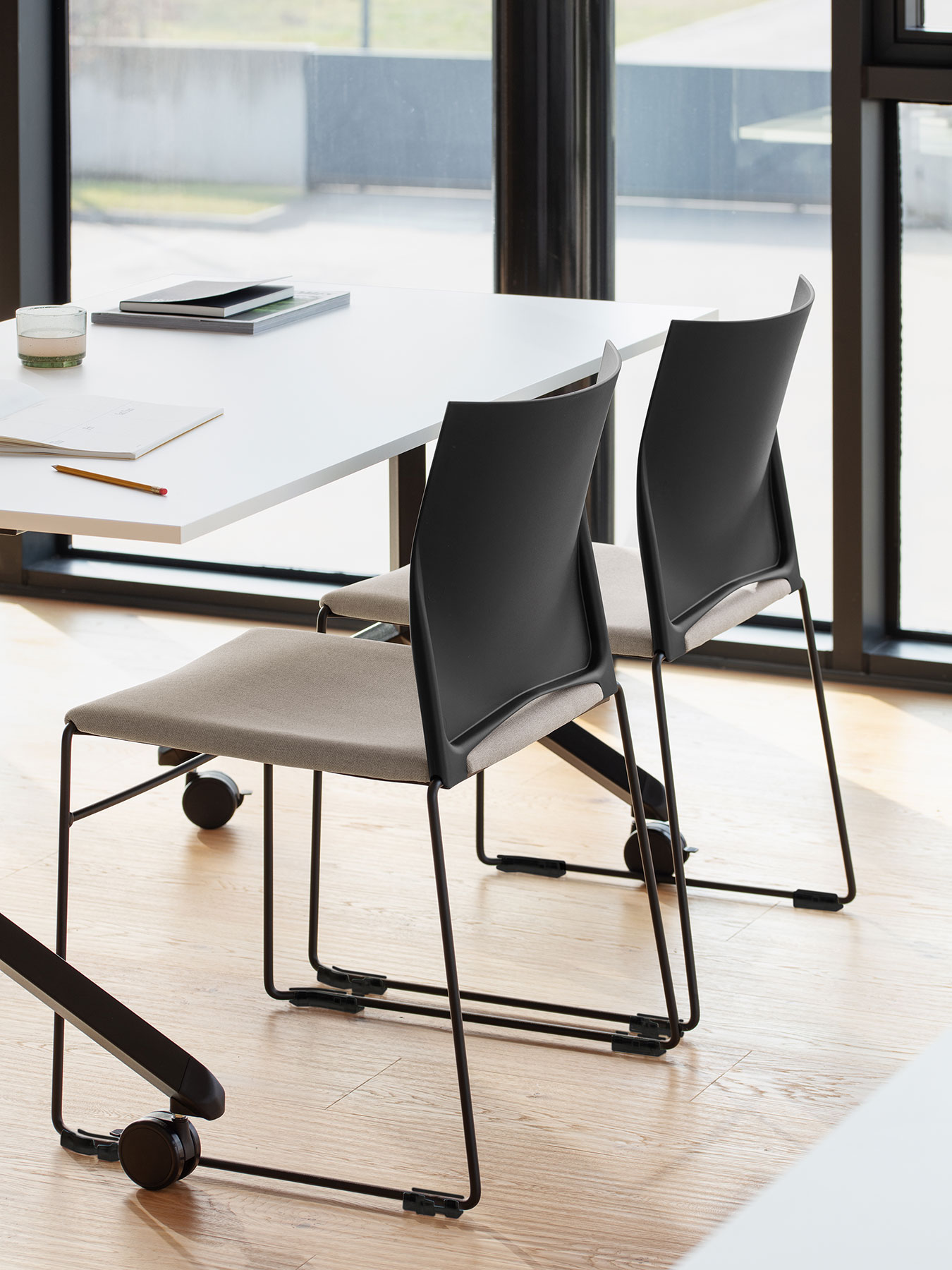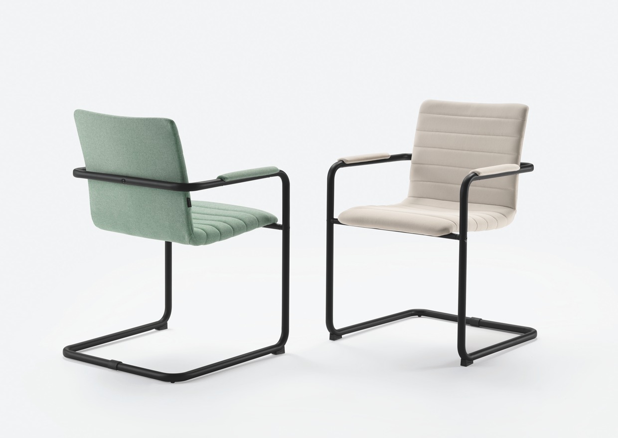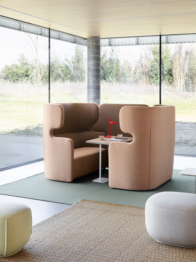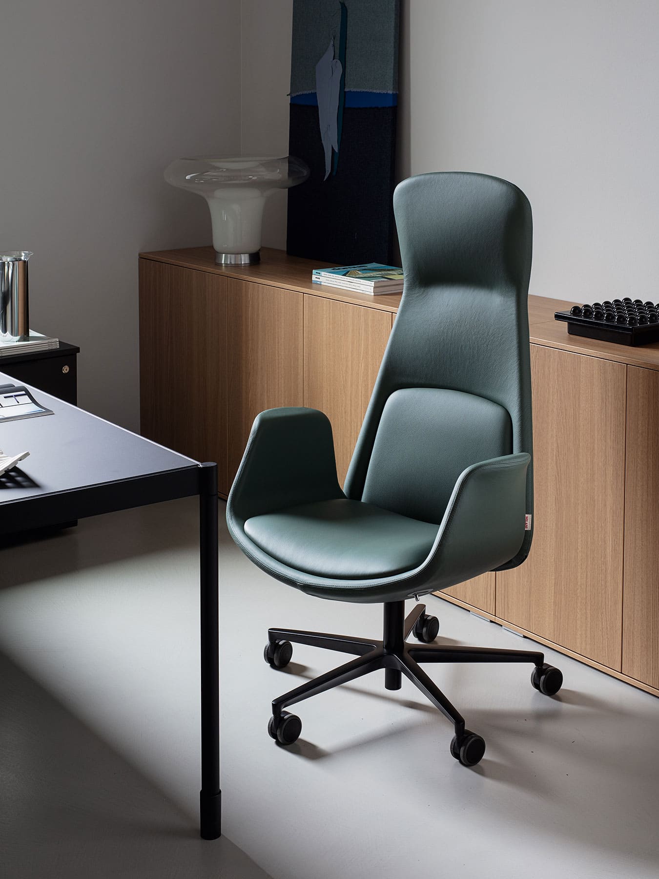 Completa il progetto una sala meeting delimitata da pareti vetrate con profili neri, arredata con tavolo HYPE e sedute CUBIKA, oltre a un’illuminazione scenografica con lampade BAHIA.
