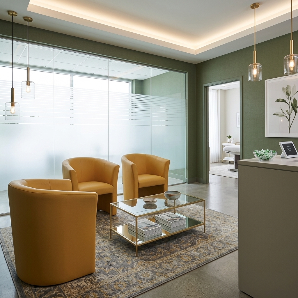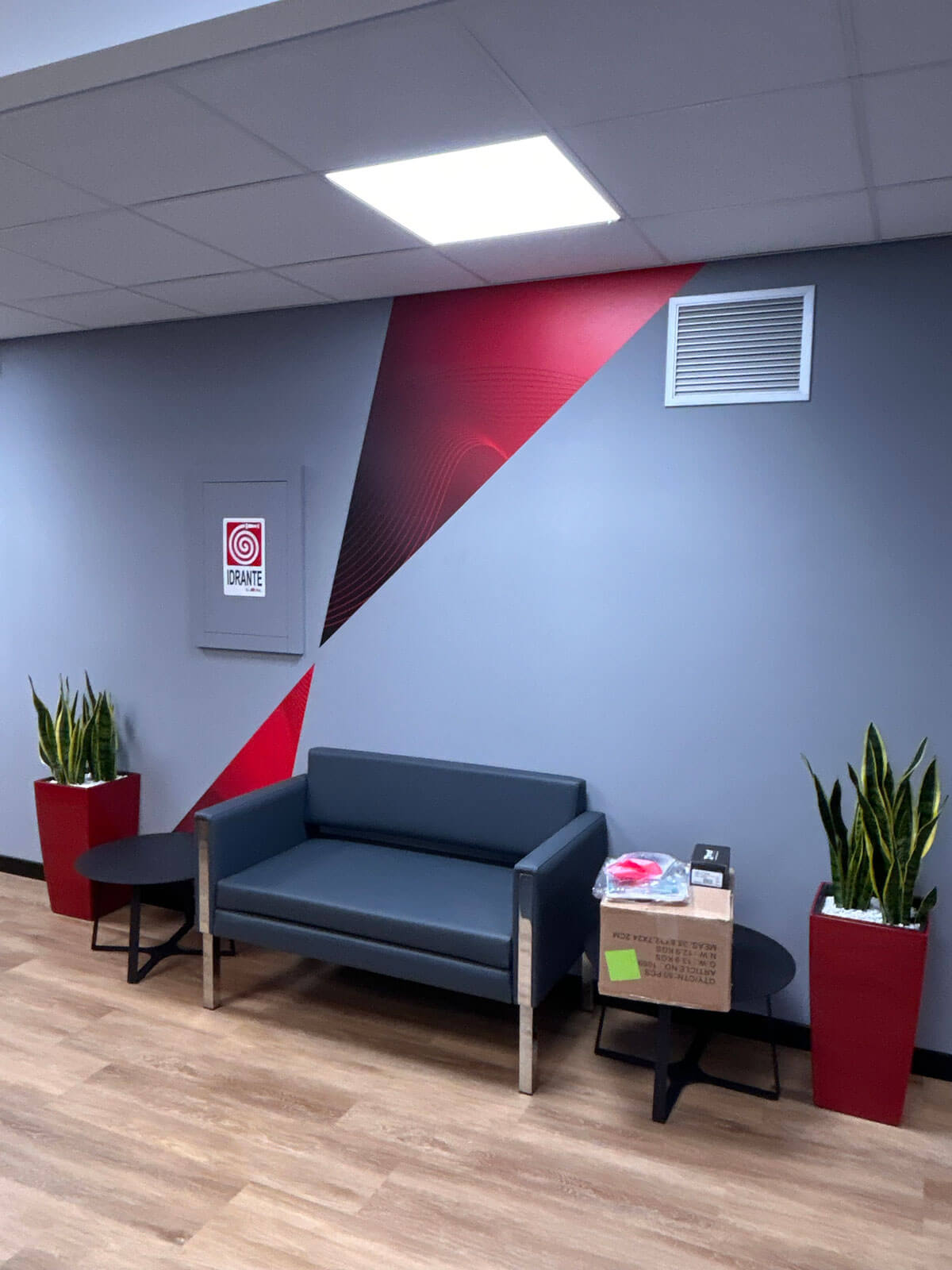 La personalizzazione degli ambienti è valorizzata da pellicole adesive e loghi aziendali in 3D, mentre la reception su misura, rivestita con pannelli dogati effetto rovere, crea un impatto visivo moderno e accogliente.