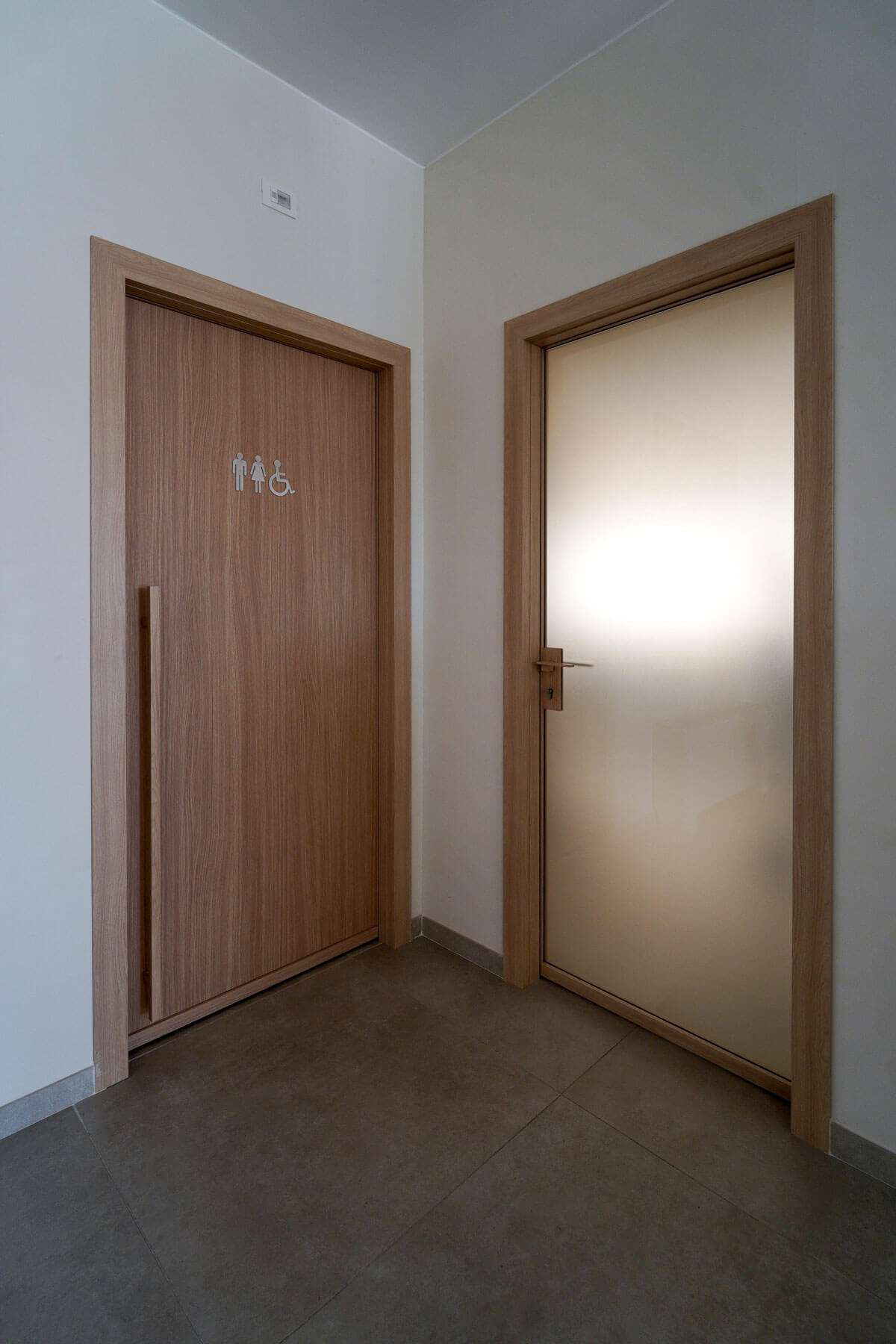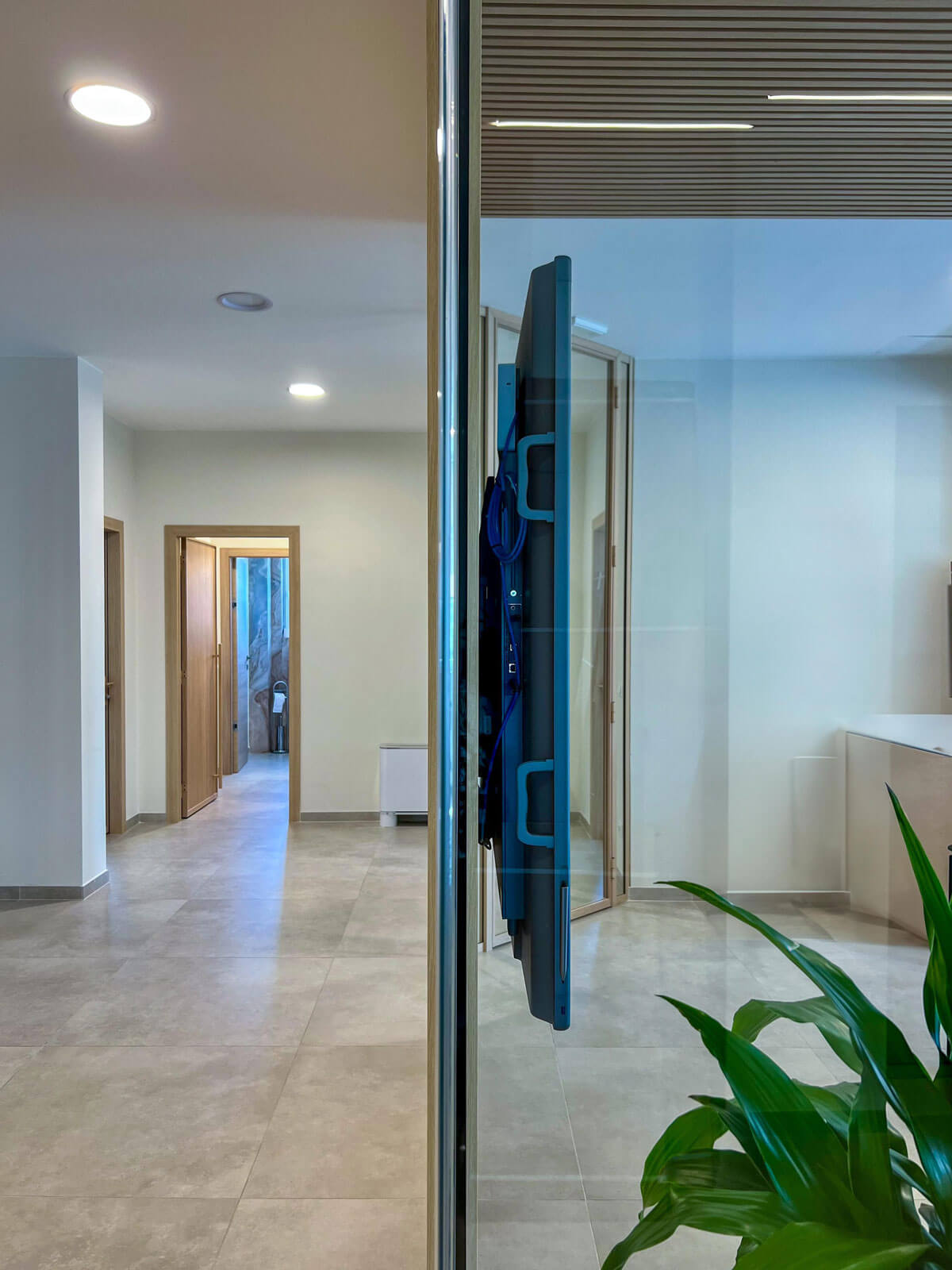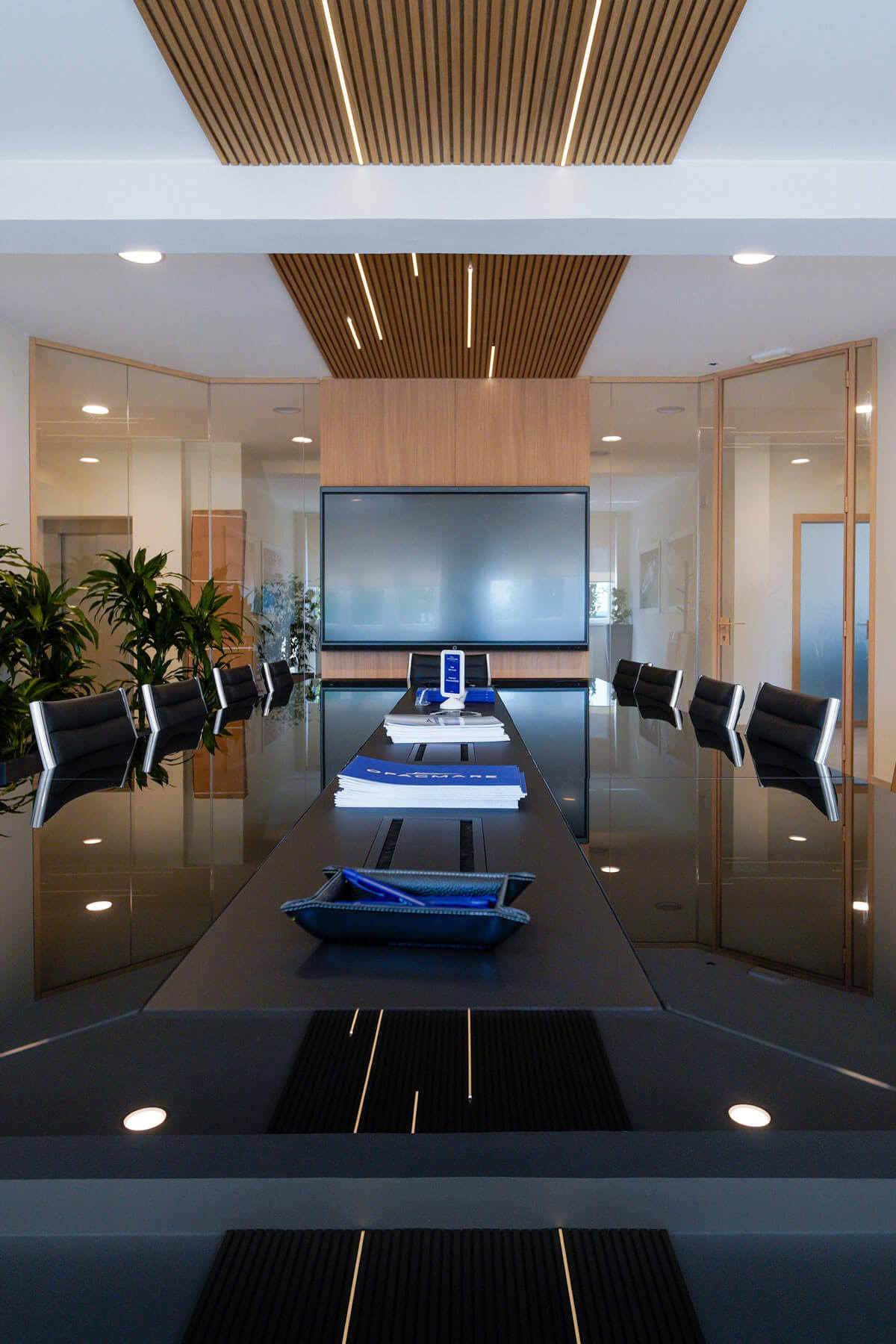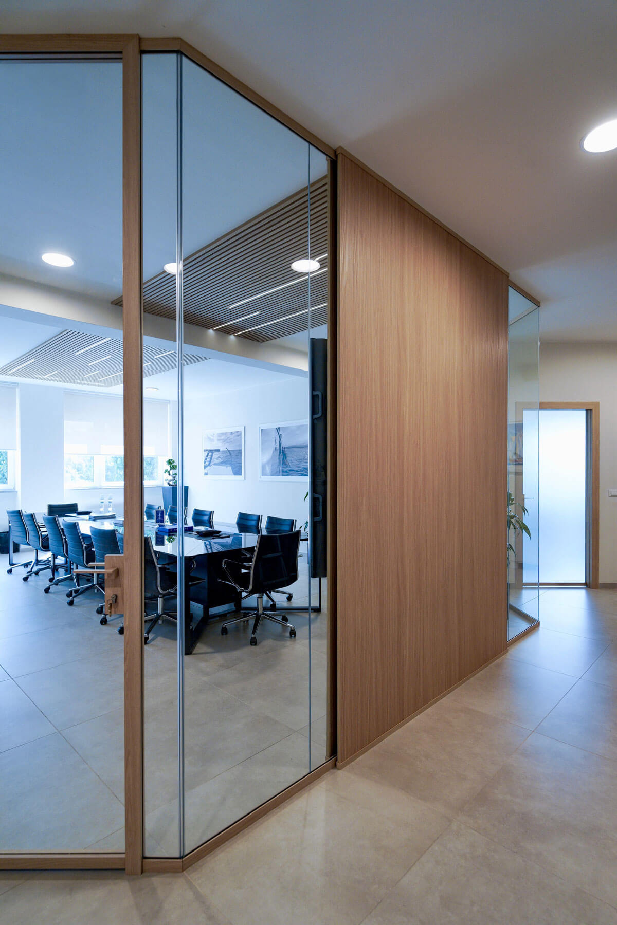 Il progetto realizzato per Opac Mare si distingue per un design elegante e coordinato, in cui materiali e finiture creano un ambiente professionale e accogliente. Le pareti vetrate modello SPETTRA di Line Office, con profili in finitura legno, definiscono gli spazi mantenendo continuità estetica e luminosità .