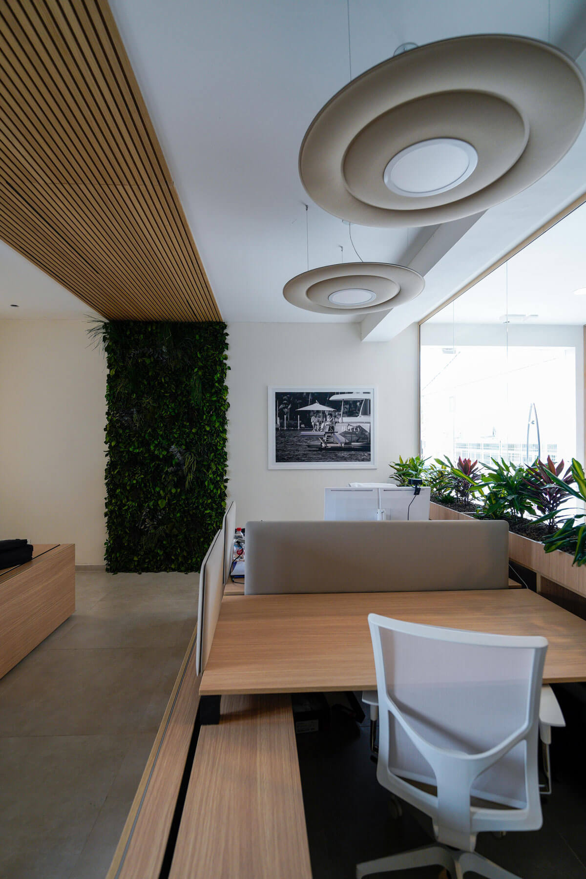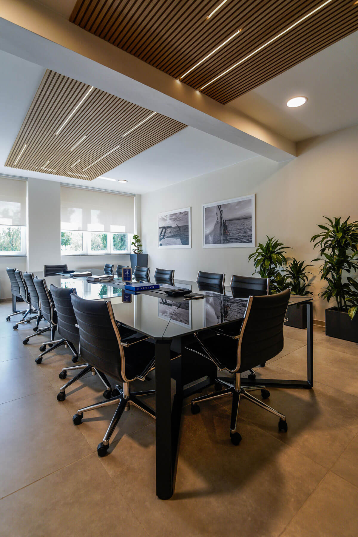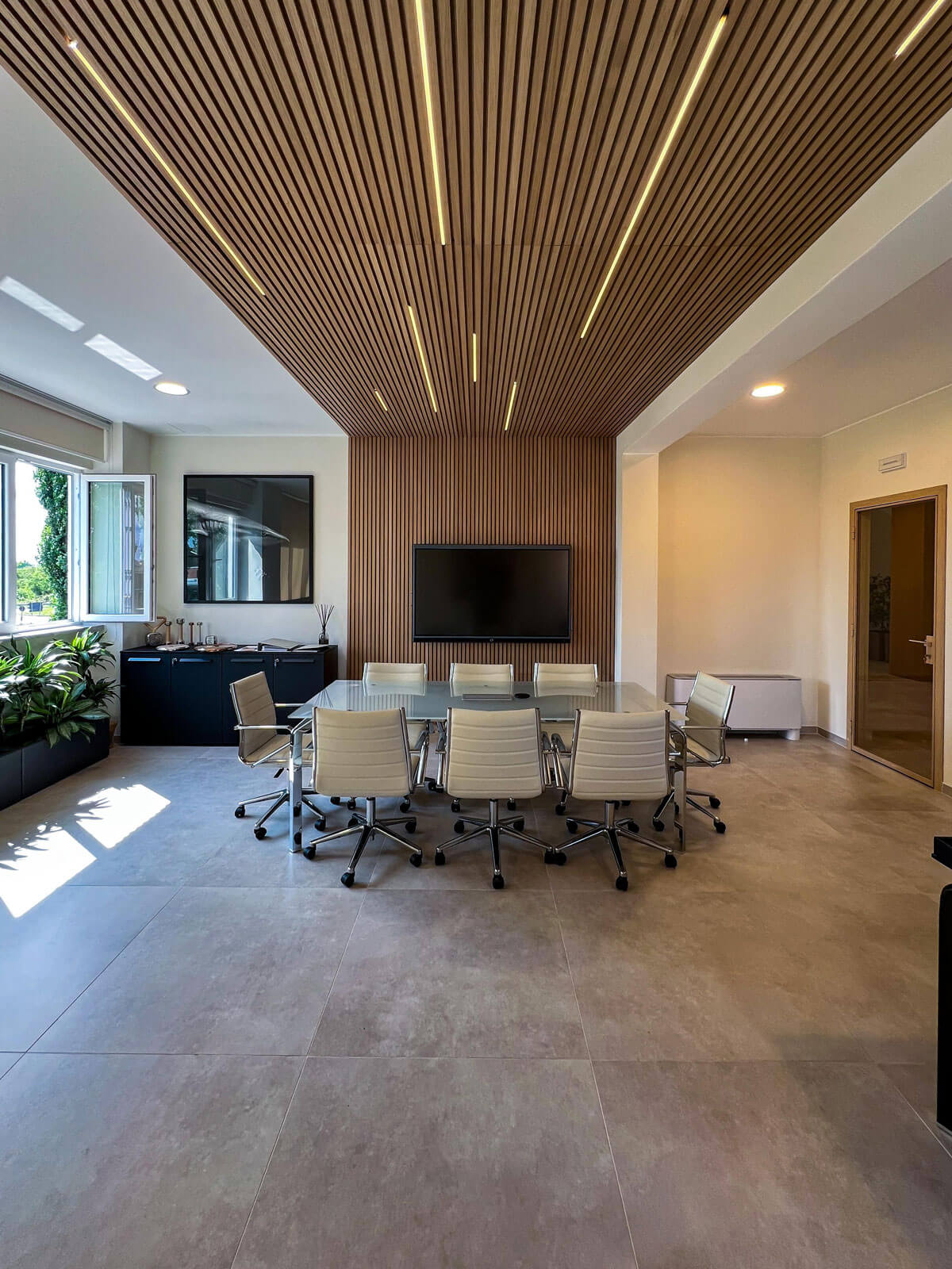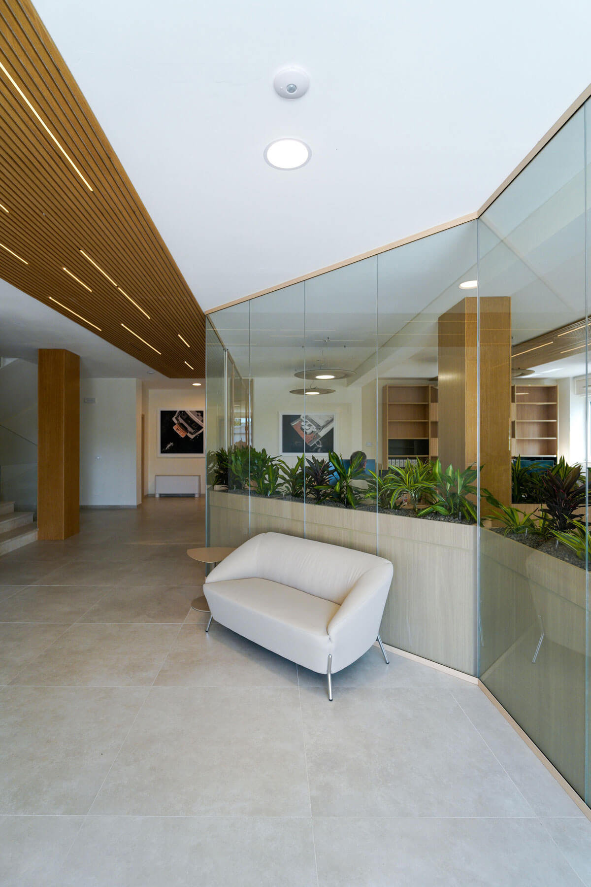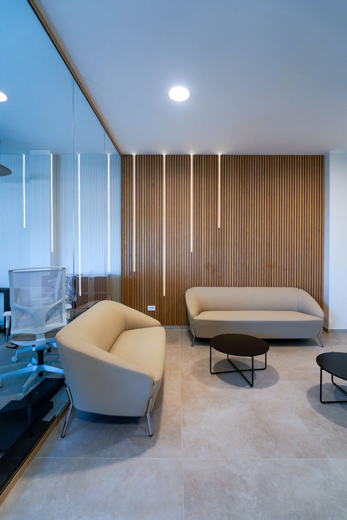 La reception su misura, realizzata con lavorazioni di falegnameria, accoglie i visitatori con uno stile raffinato, affiancata dal divano NUVOLA di Milani. Le postazioni operative in finitura noce si integrano perfettamente con l’ambiente, mentre le sale riunioni, una presidenziale e una più operativa, offrono soluzioni tecnologiche avanzate e arredi coordinati.