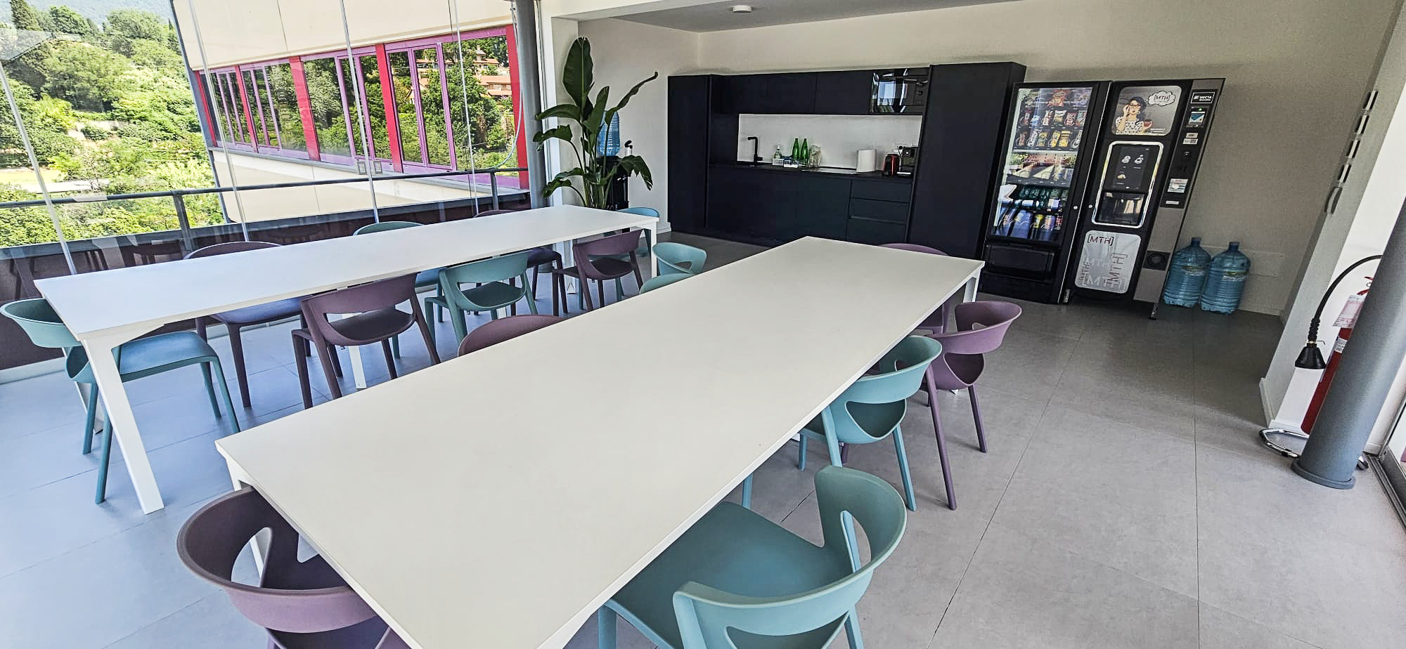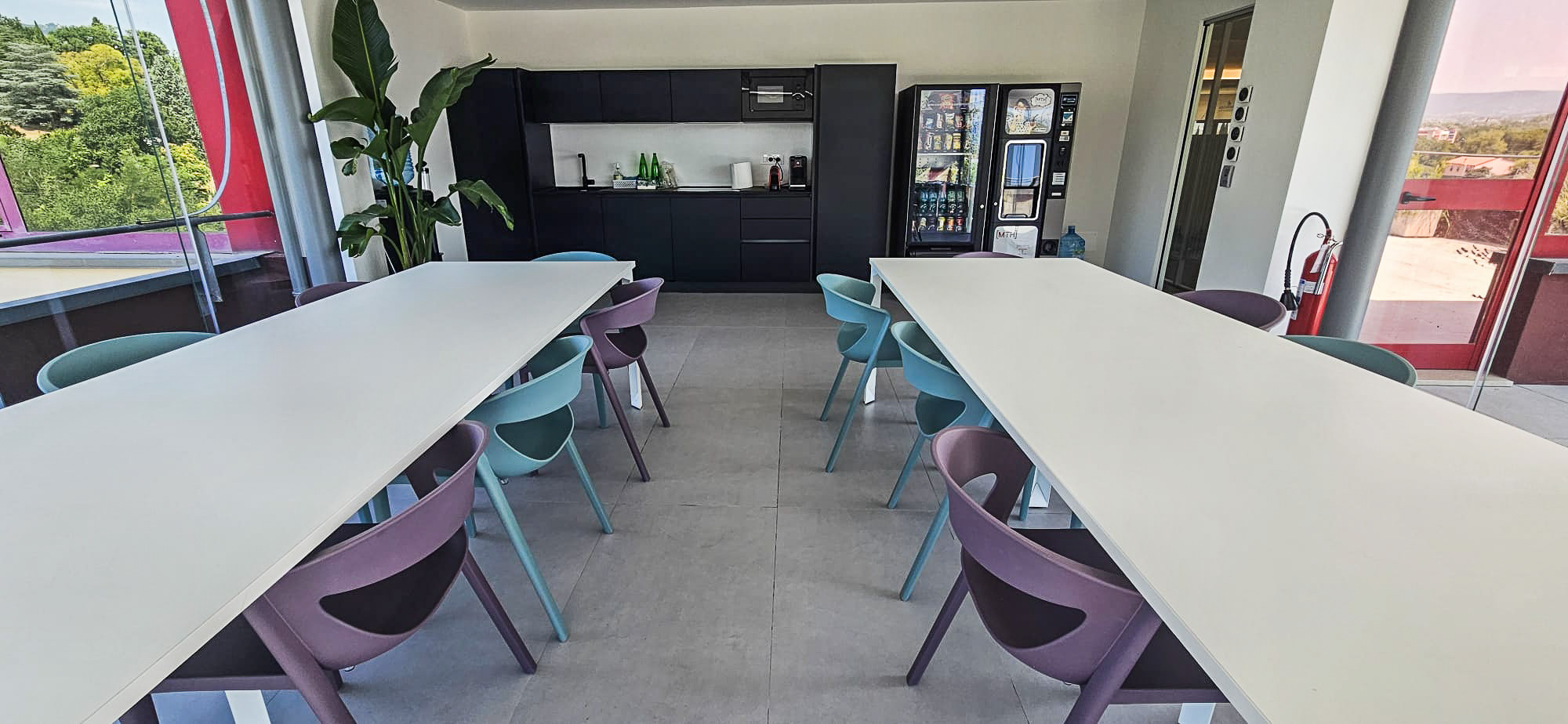 L’ambiente è completato da un’area break strutturata con tavoli comuni modello Enna di DVO, sedute Kicca One di Kastel e cucina Spagnol Mobili, pensata come spazio di condivisione e pausa all’interno dell’ufficio.