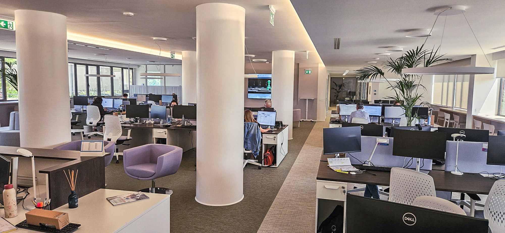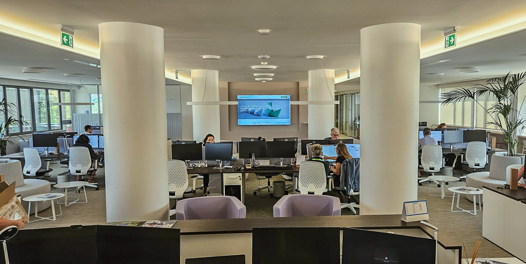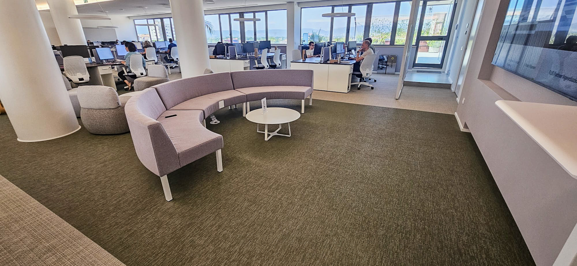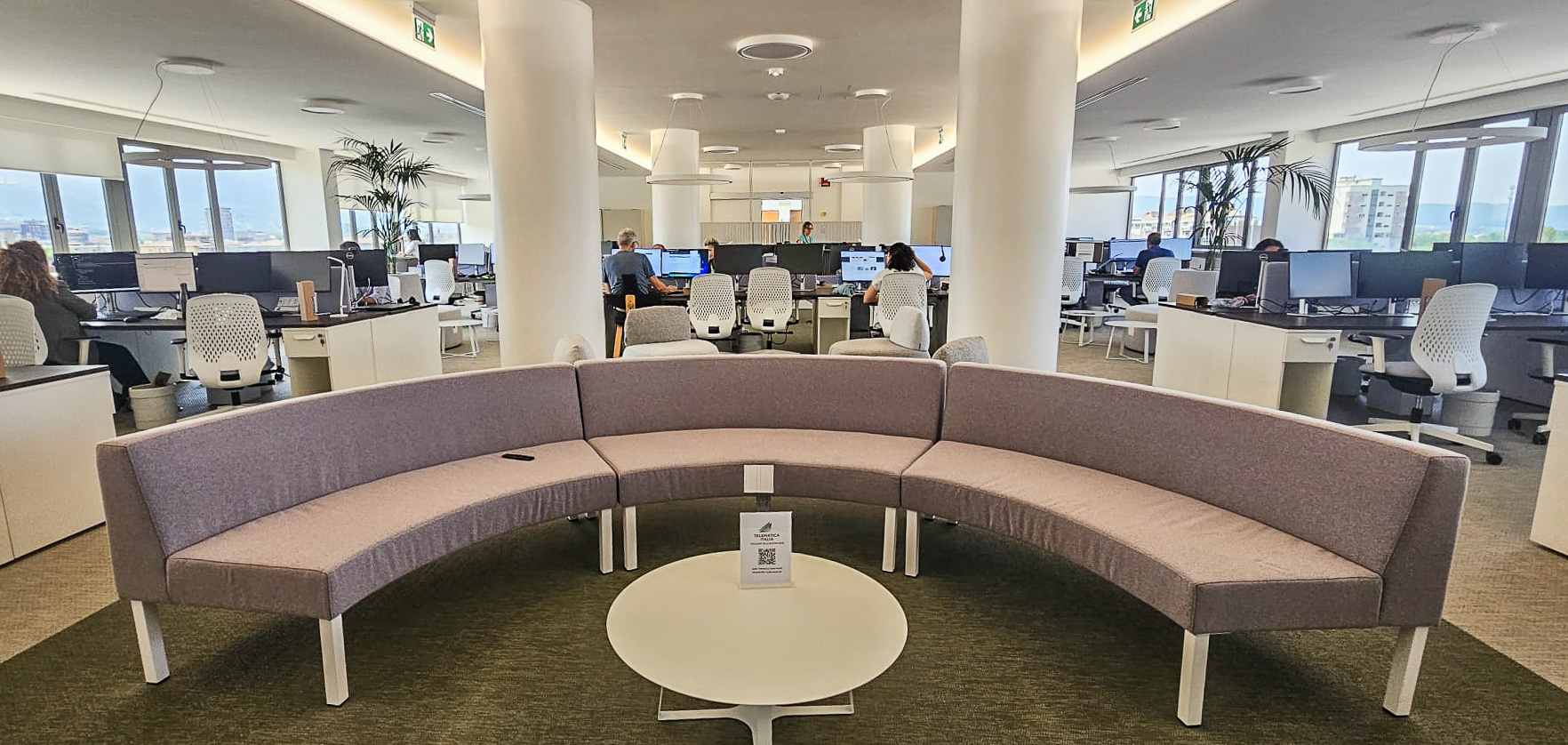 Per la sede Telematica di Terni, l’obiettivo era creare un ambiente di lavoro moderno e funzionale, capace di integrare aree operative, spazi di accoglienza e zone dedicate alla socialità all’interno di un unico open space.