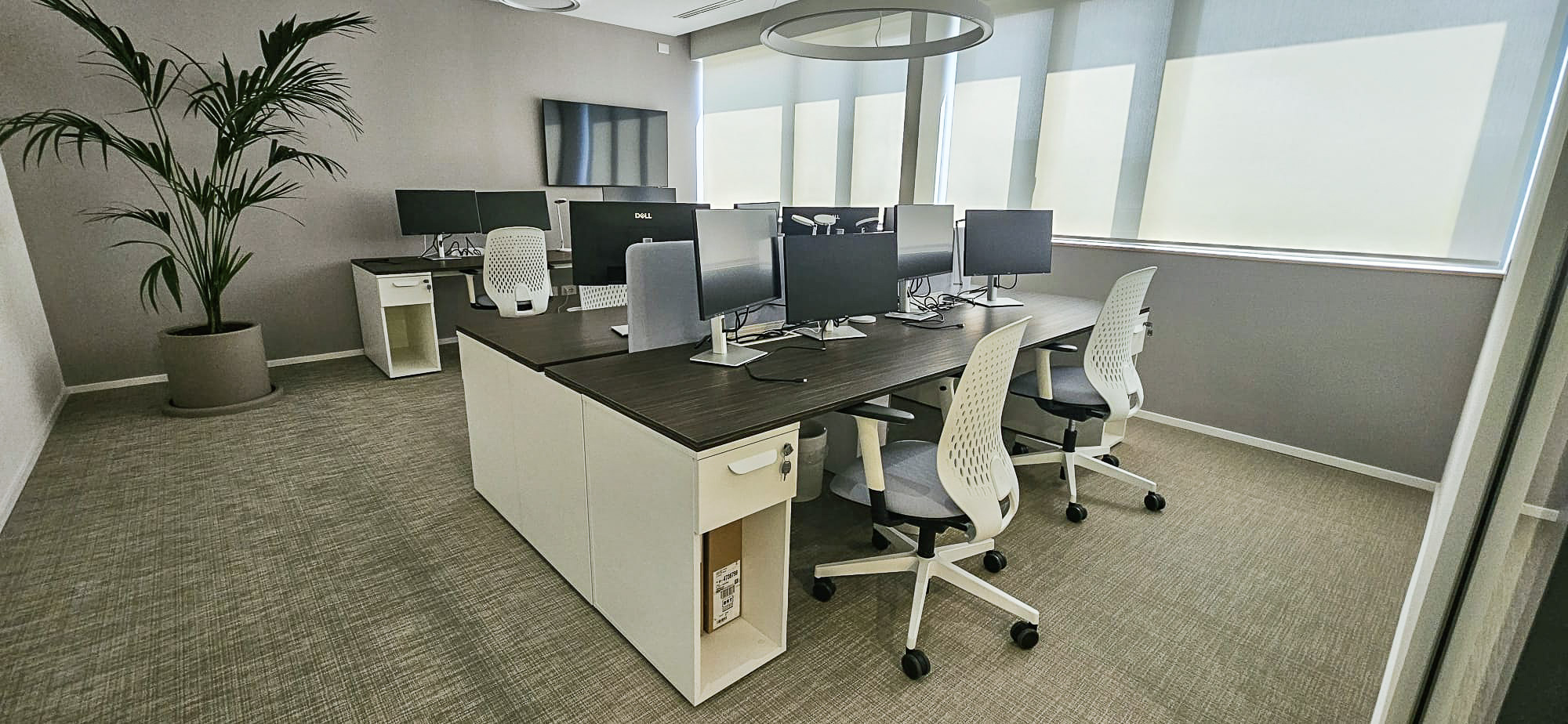 Le postazioni operative sono state progettate su misura, integrate con cassetti e vani portaoggetti personali, per rispondere alle esigenze quotidiane di organizzazione e praticità .