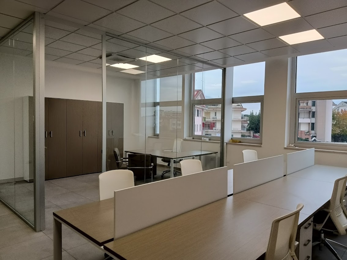 Open space con pareti vetrate e spazi di lavoro funzionali.