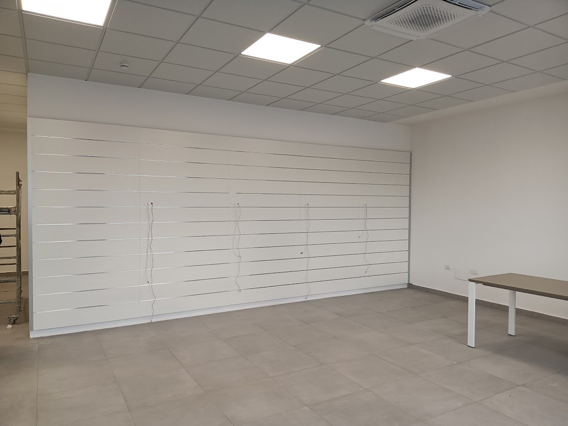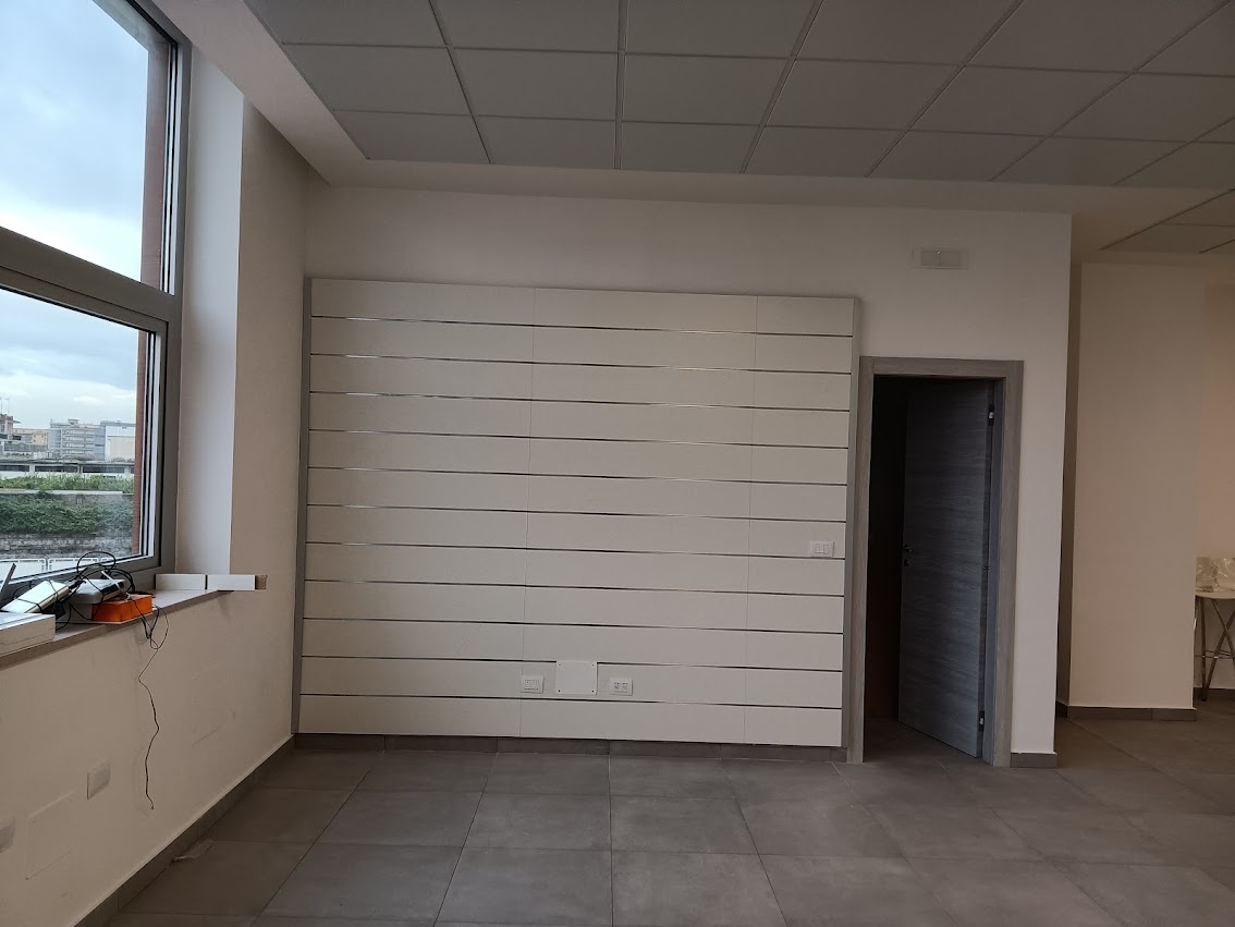 Per la sede Urmet di Caserta, l’obiettivo era trasformare un open space in un ambiente organizzato, capace di integrare diverse funzioni operative senza rinunciare a luminosità e continuità visiva.