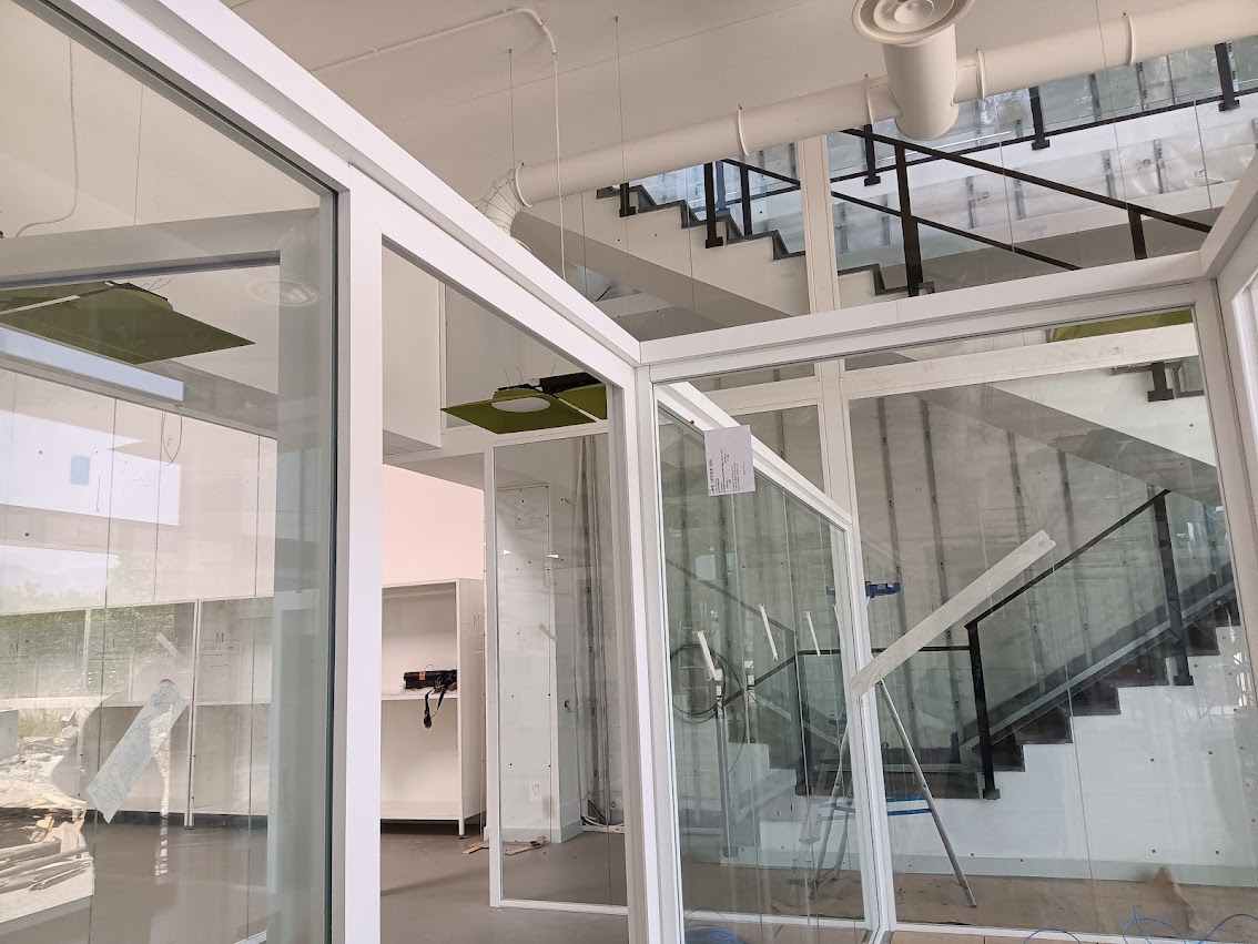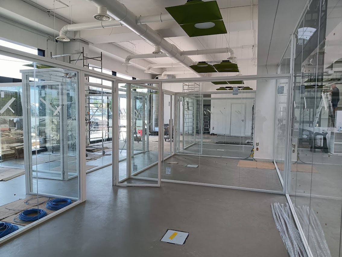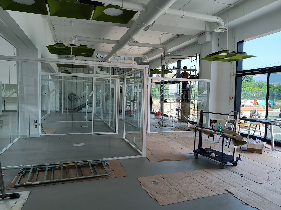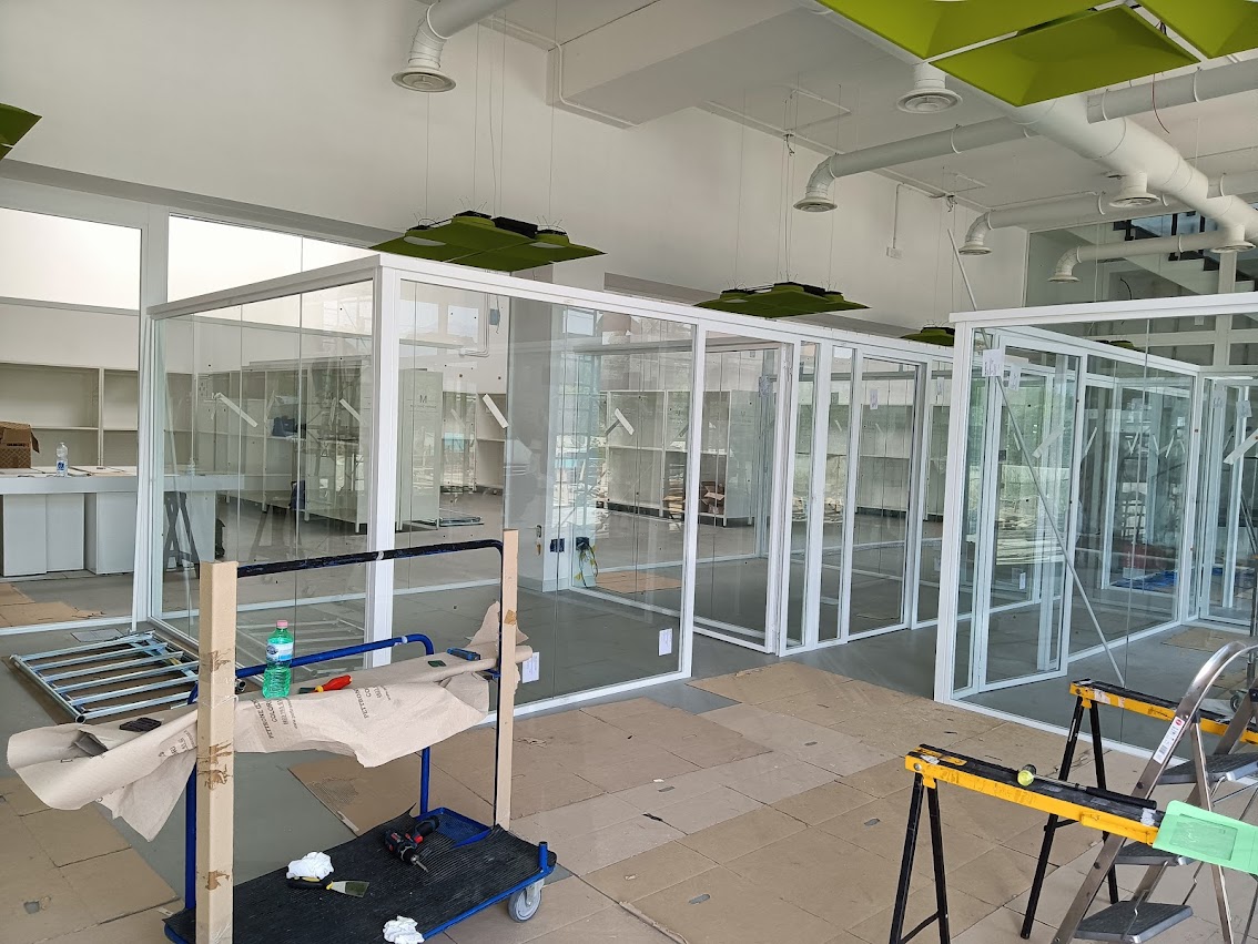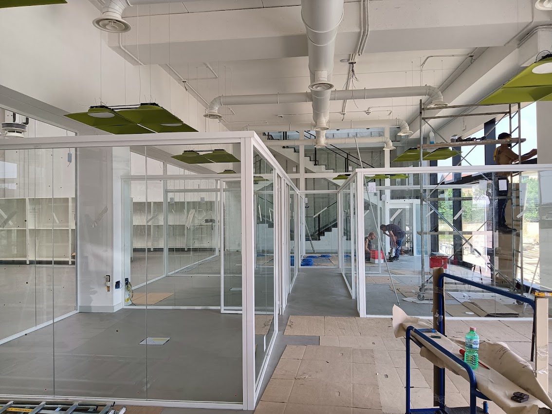 La sfida principale era suddividere gli ambienti in modo efficace anche in assenza di finestre dirette, garantendo aerazione, luminosità e conformità alle disposizioni sulla sicurezza nei luoghi di lavoro.
