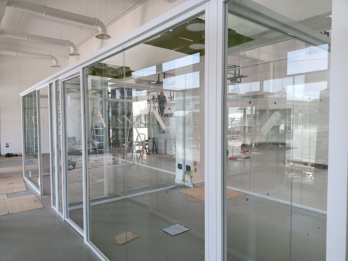 La soluzione è stata l’inserimento di pareti vetrate open space modello SPETTRA di Line Office, con profili in finitura bianco. Questo sistema ha permesso di creare più uffici singoli senza chiudere completamente gli spazi, lasciando libero il passaggio dell’aria grazie alla mancata chiusura a soffitto.