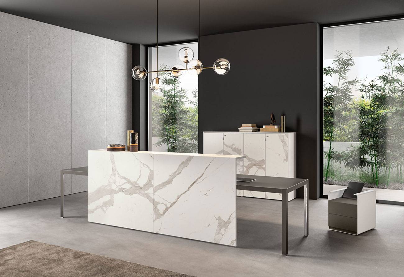 Scoprite la collezione reception linea Hype, geometrie raffinate e materiali di alta gamma.