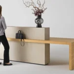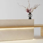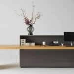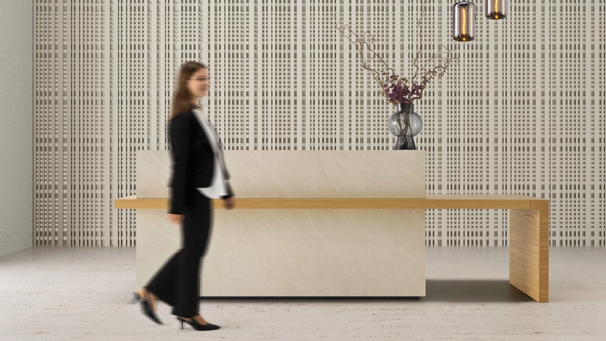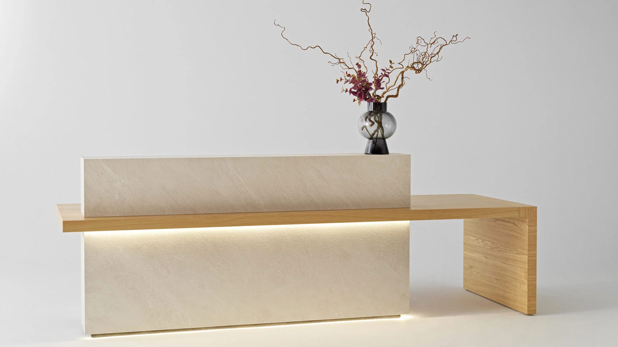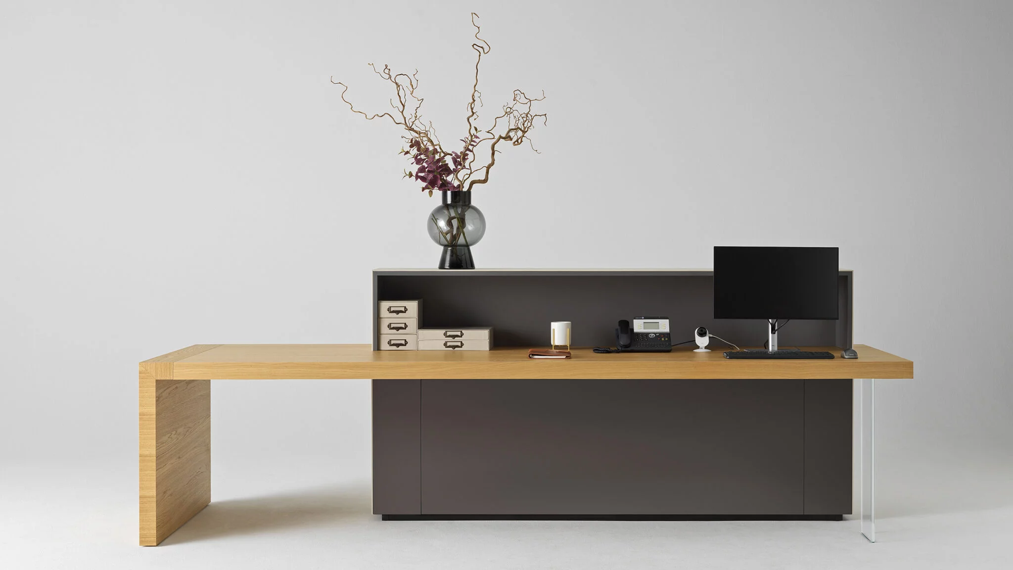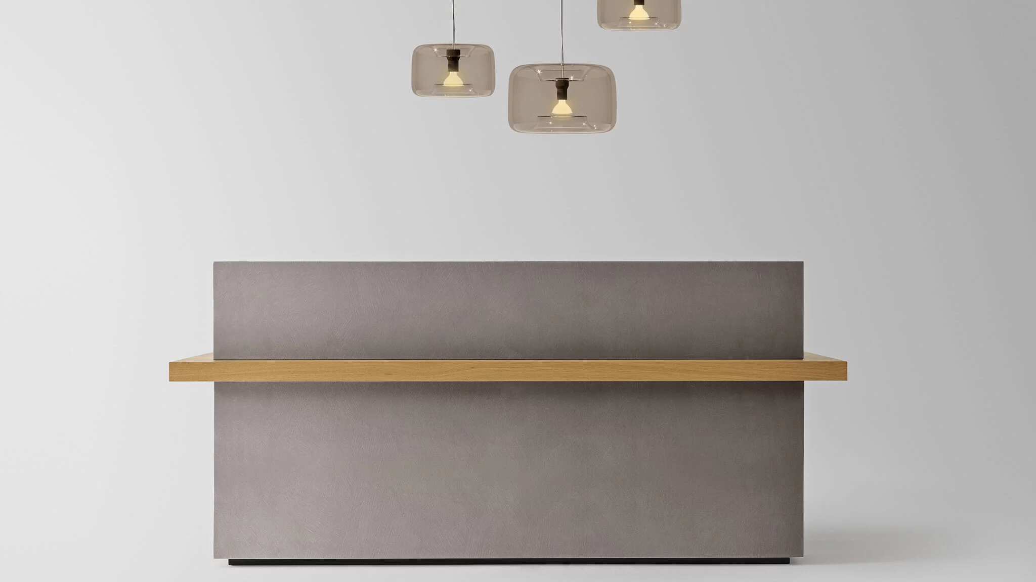 Il design essenziale e le proporzioni equilibrate caratterizzano una reception moderna dal segno deciso e contemporaneo. Il piano di forte spessore trasmette solidità e affidabilità, mentre i volumi puliti e leggeri contribuiscono a creare una composizione armonica, capace di unire eleganza formale e comfort operativo.