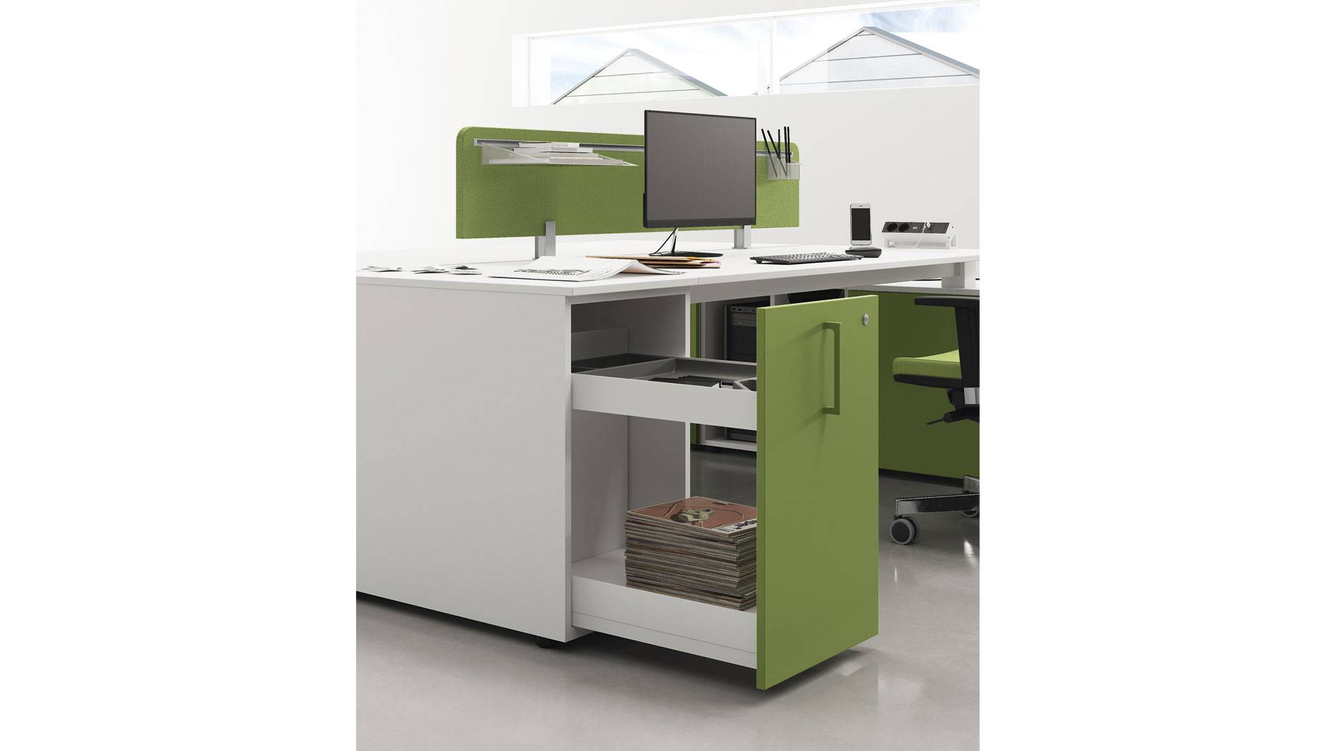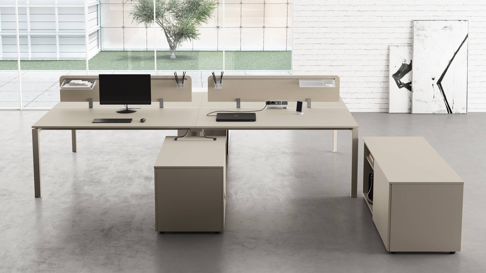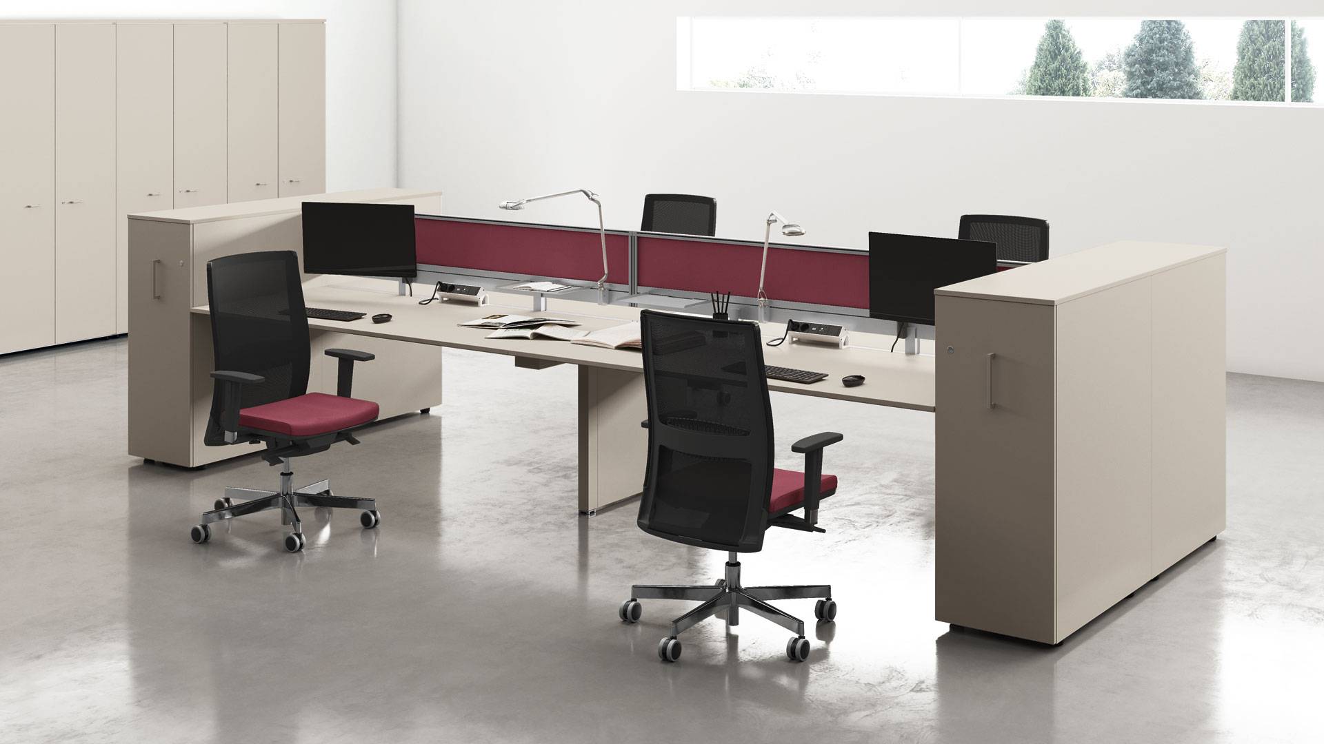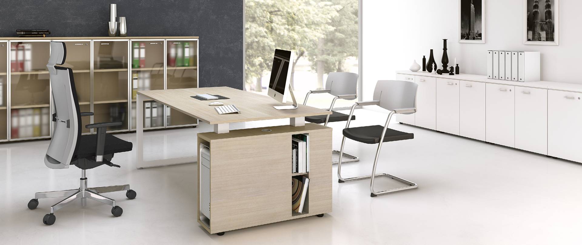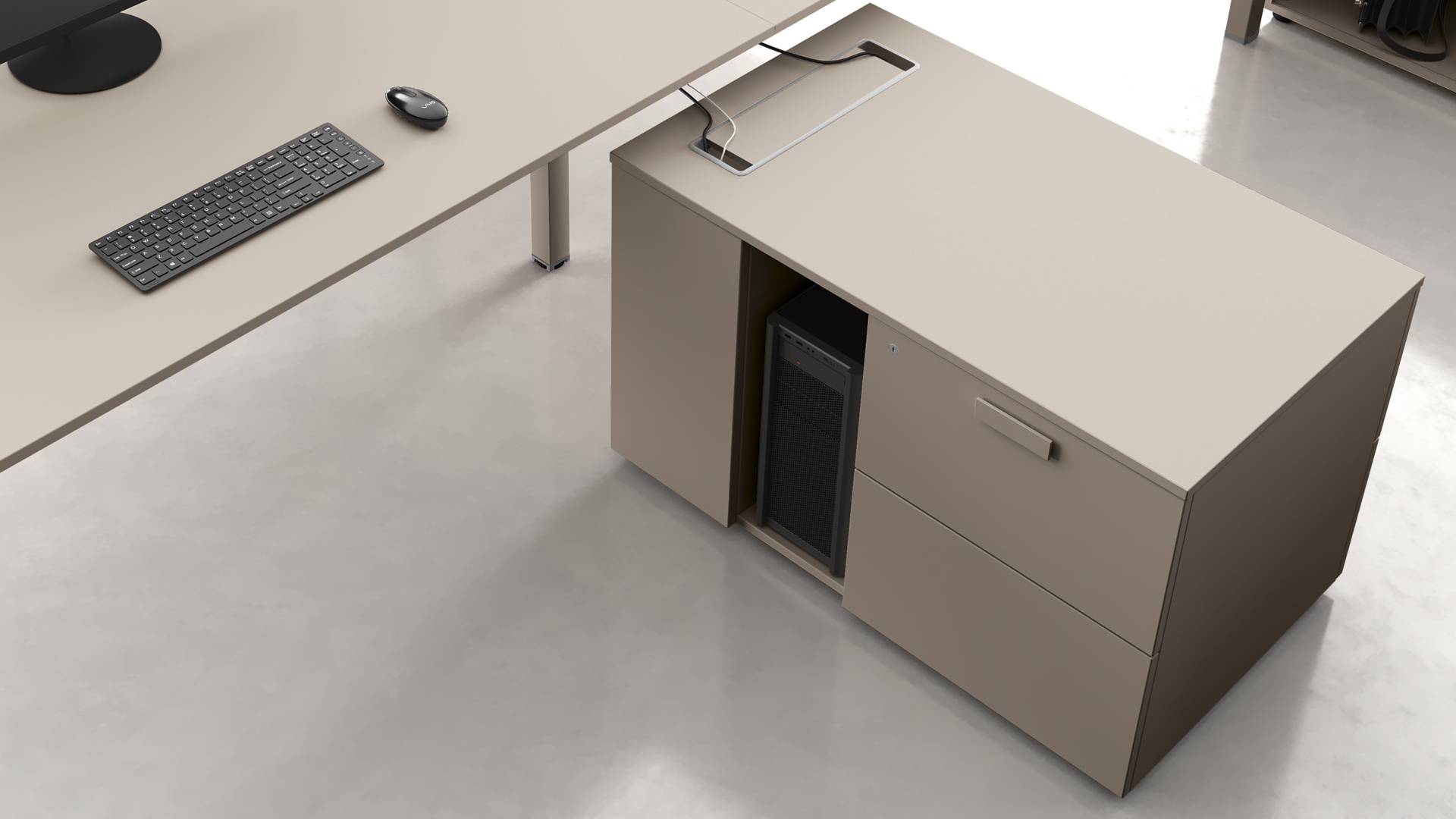 La qualità, gli accessori tecnologici, i materiali, le finiture e i colori danno vita ad un arredamento completo per gli uffici operativi. La linea 5° Element OP offre una ampia gamma di soluzioni con elementi coordinati per arredare per intero tutta la zona lavorativa. Dai piani di lavoro alle cassettiere su ruote, ogni elemento si integra gradevolmente con gli altri, senza dimenticare l’ottimo rapporto tra qualità e prezzo