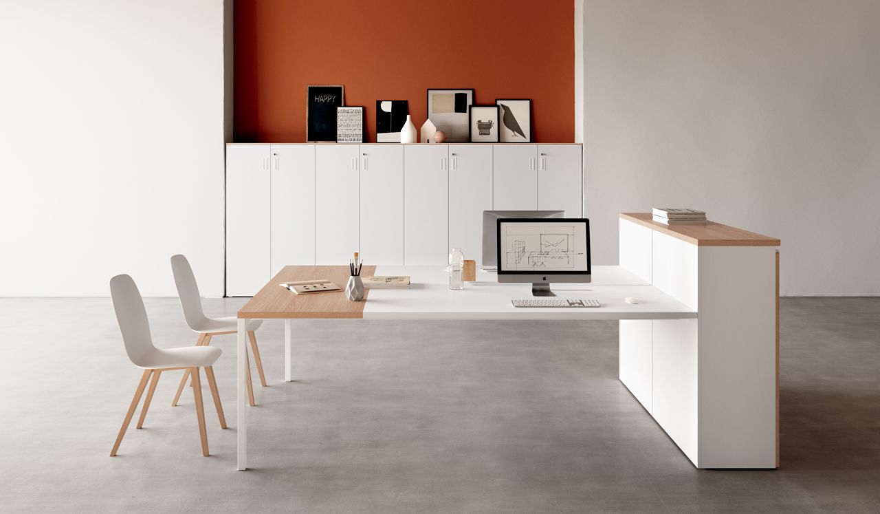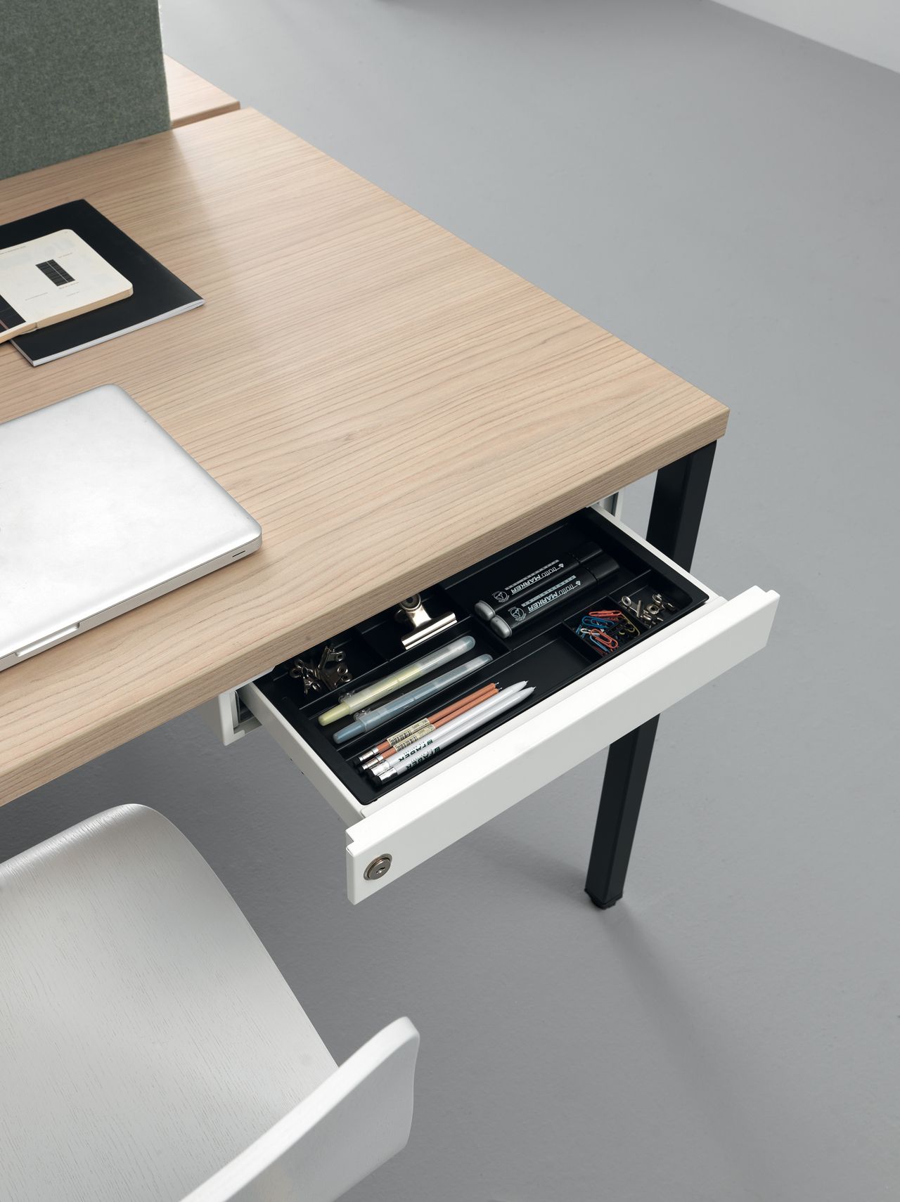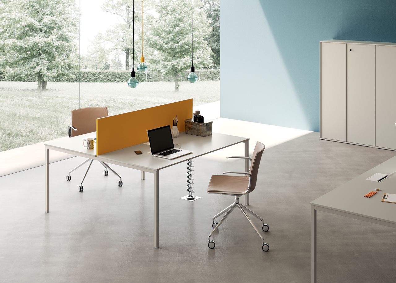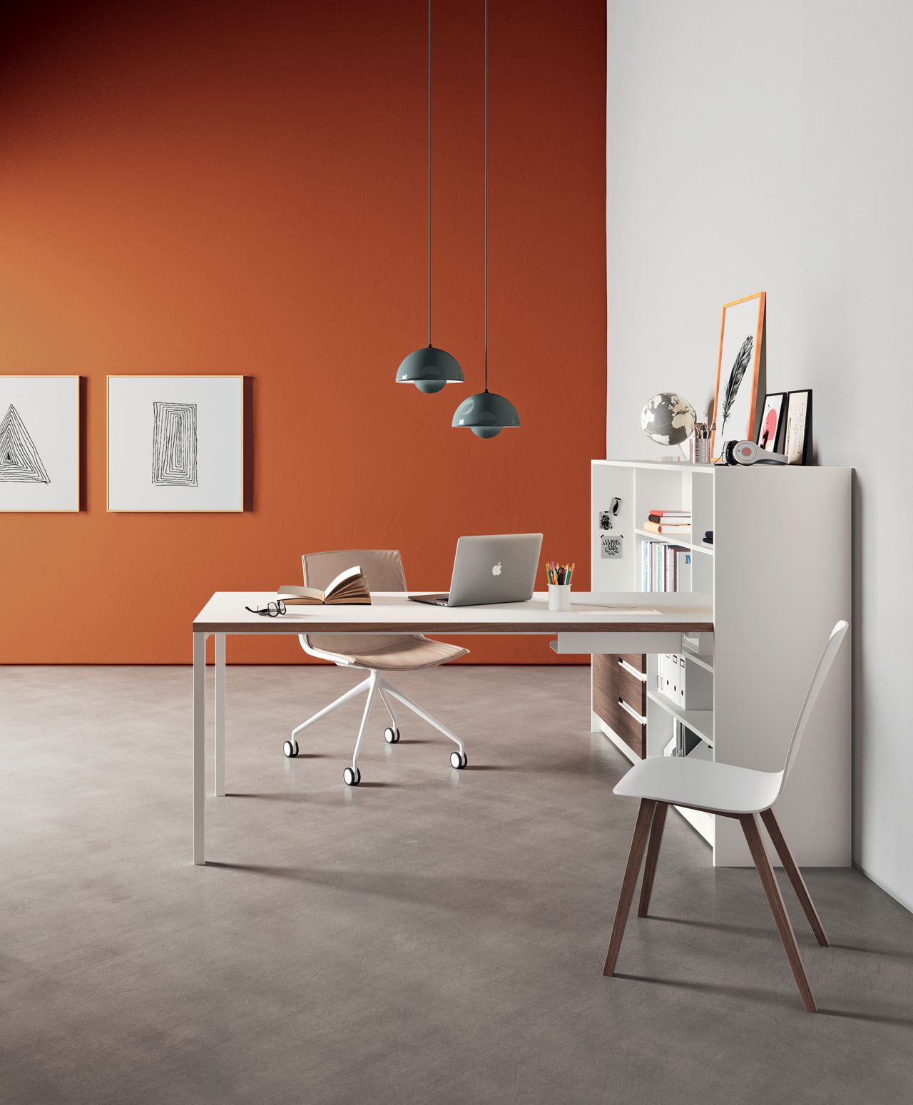La collezione Agile per l’ufficio operativo è caratterizzata da linee semplici e geometriche arricchite dalla possibilità di scelta tra due tipologie di spessori dei piani, 14 o 30 mm, e dalla varietà delle finiture della gamba.