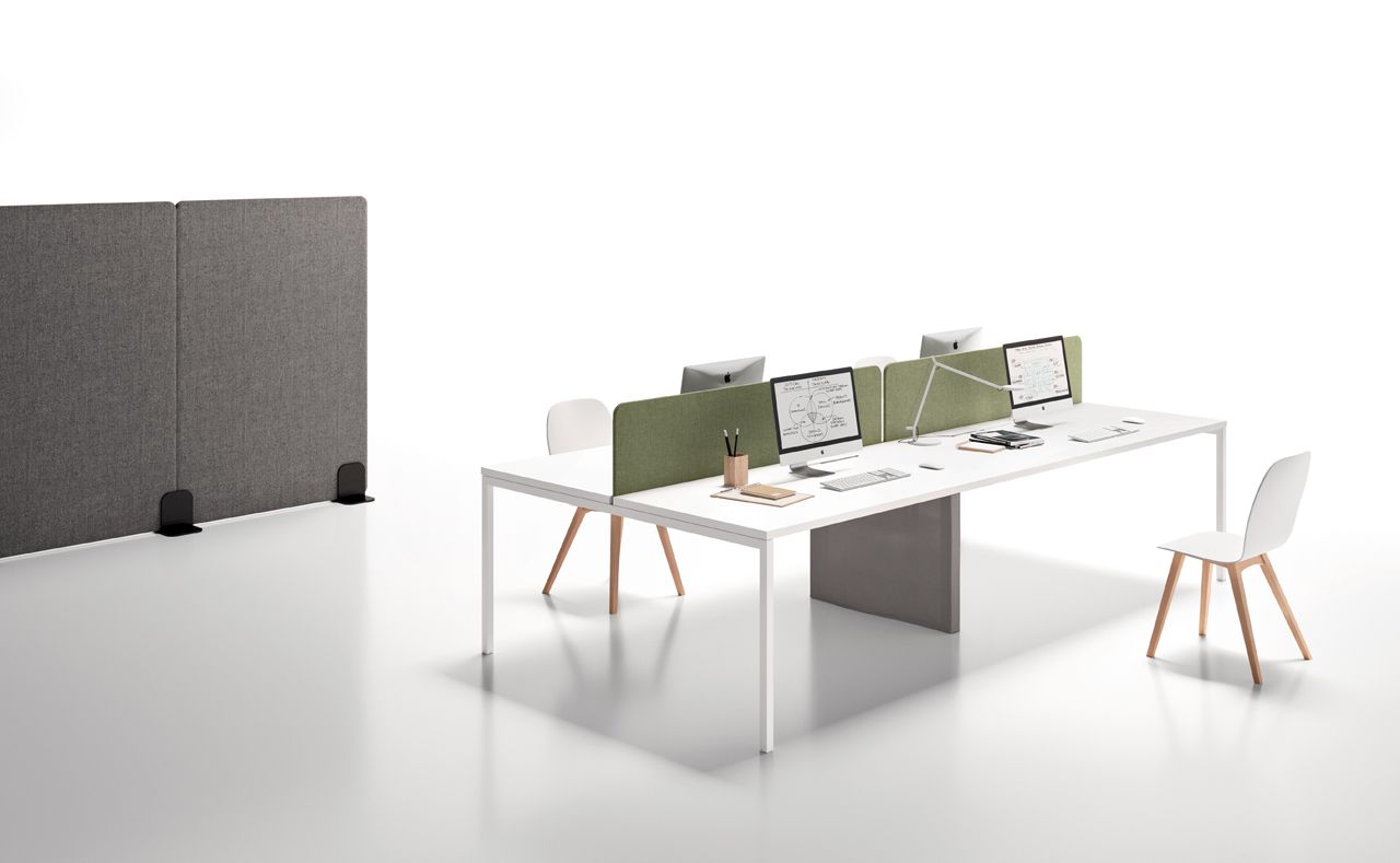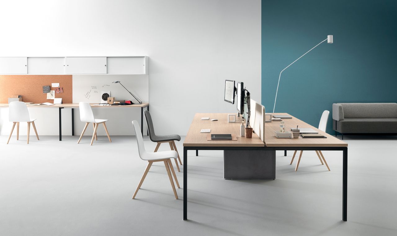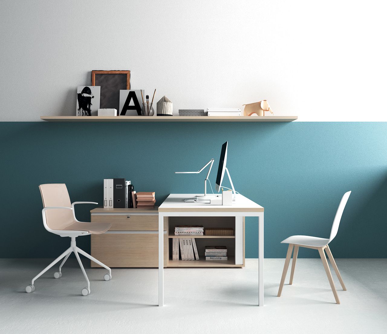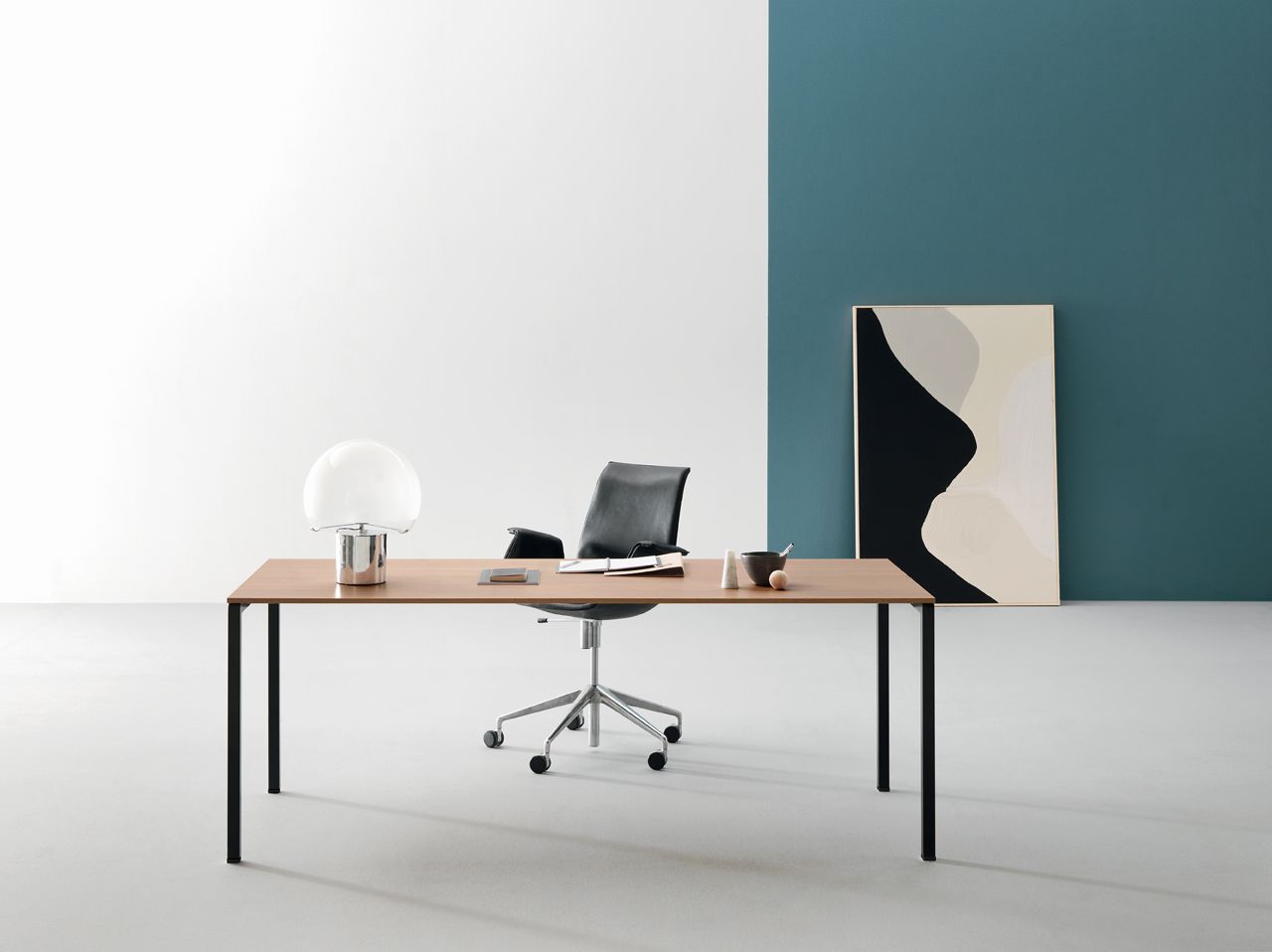 La collezione Agile per l’ufficio operativo è caratterizzata da linee semplici e geometriche arricchite dalla possibilità di scelta tra due tipologie di spessori dei piani, 14 o 30 mm, e dalla varietà delle finiture della gamba.
