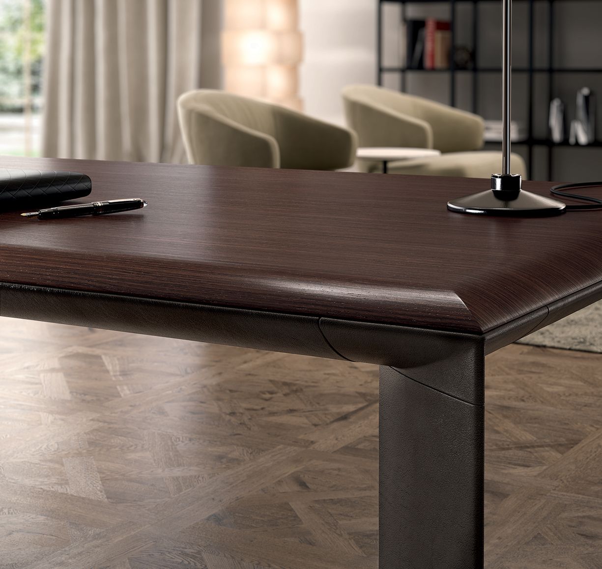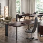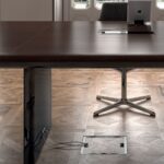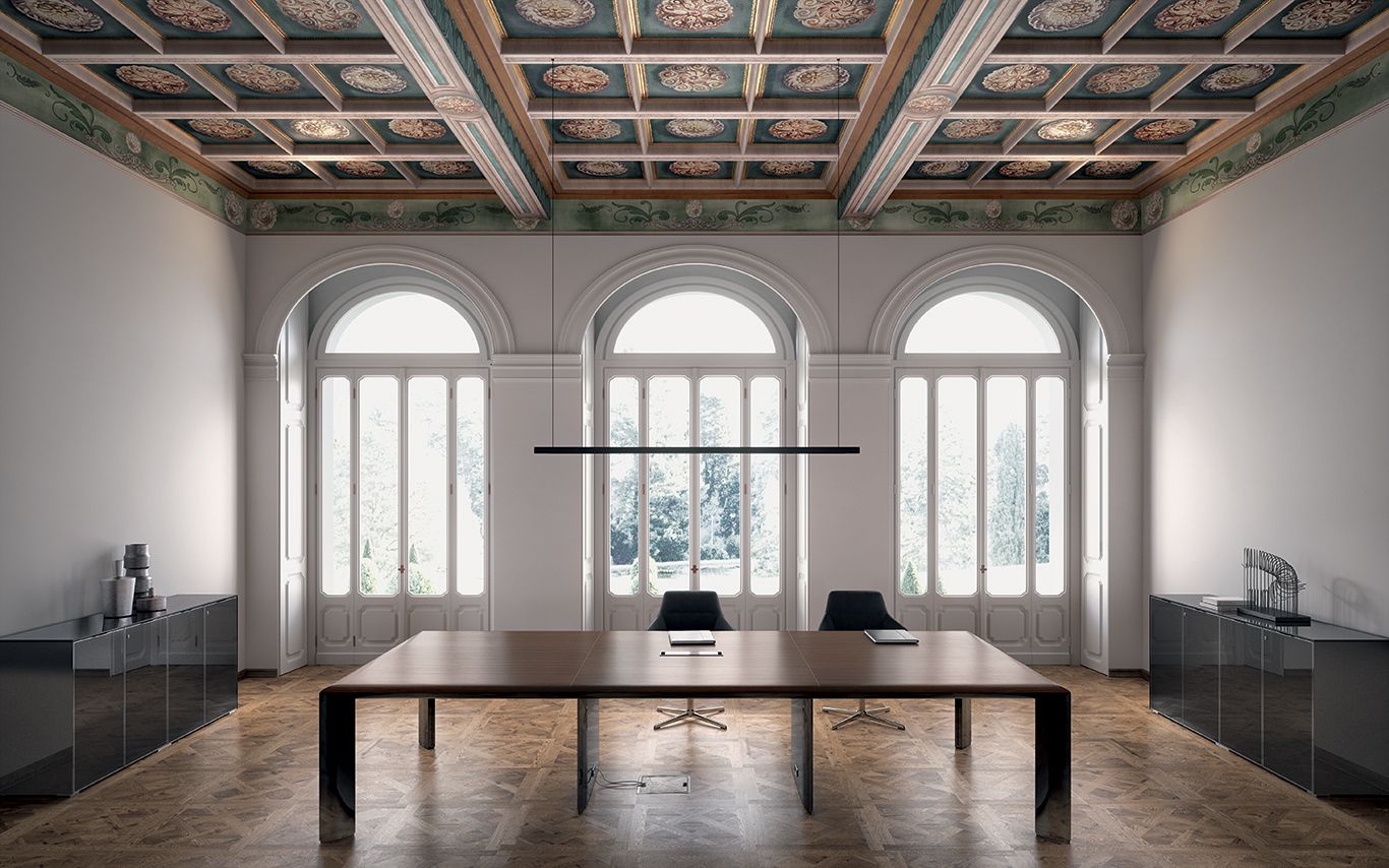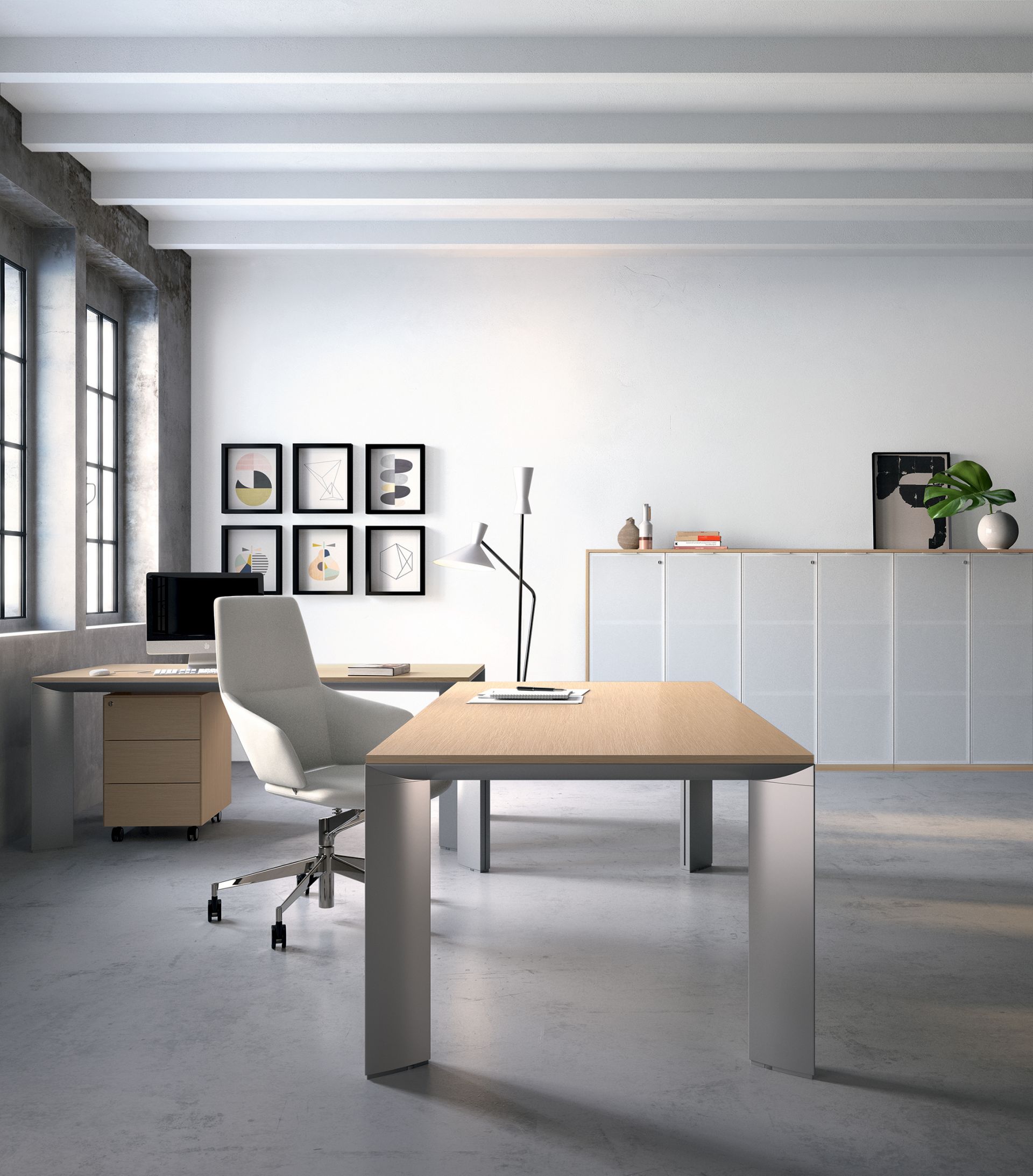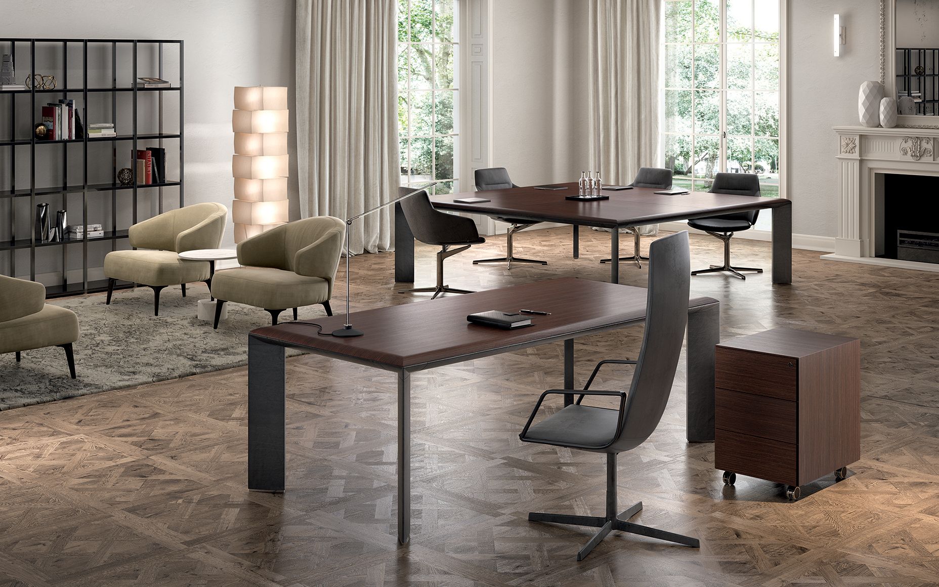 La collezione per l’ufficio presidenziale Kono concilia estetica, prestigio ed essenzialità. Sensazioni ed emozioni classiche, naturali o glamour grazie al sistema strutturale in alluminio che con un giunto raccorda struttura perimetrale e gambe. Design e flessibilità anche per i tavoli riunione che possono essere allungati e prevedere il contenimento e il passaggio dell’elettrificazione.