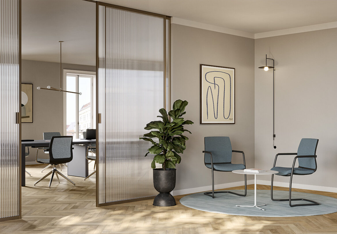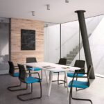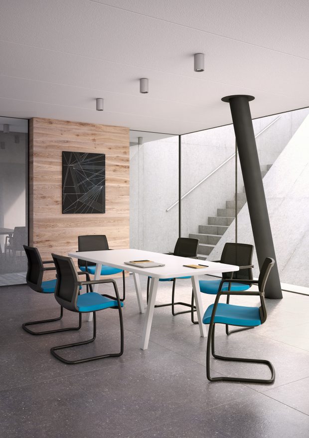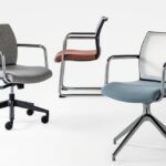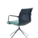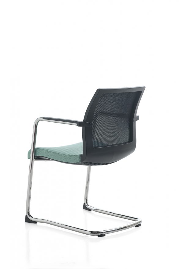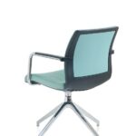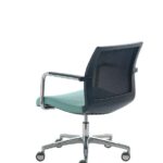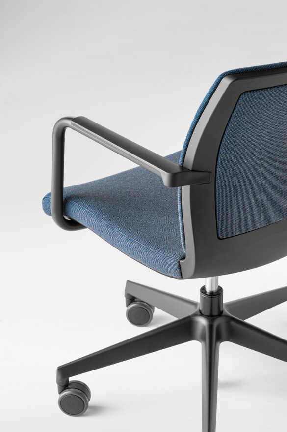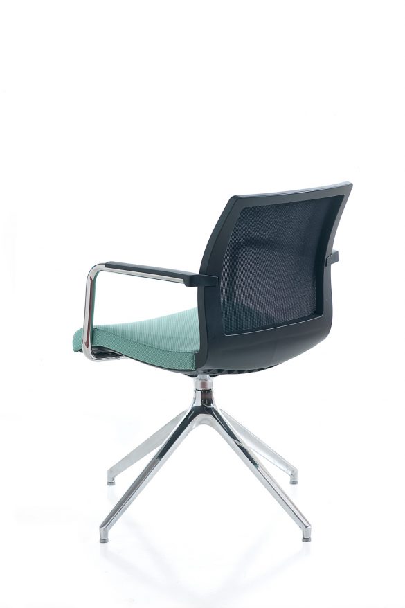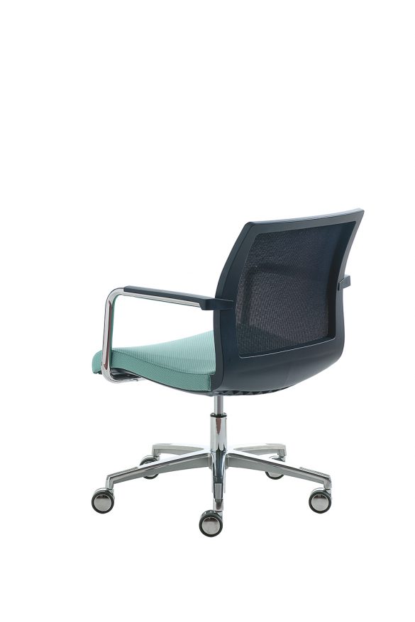 La poltroncina Karma chair è disponibile nella versioni con telaio fisso a slitta oppure girevole con base piramidale a 4-piedi e base a 5 razze con ruote. Karma chair può avere lo schienale in rete, oppure imbottito.