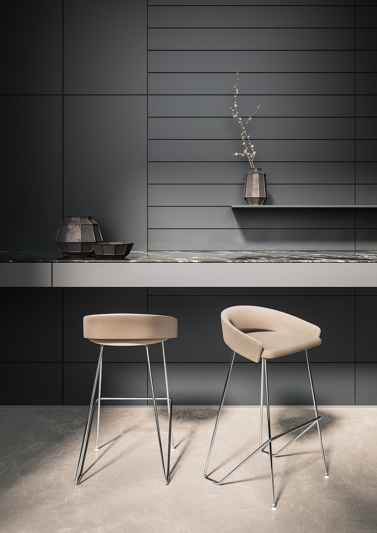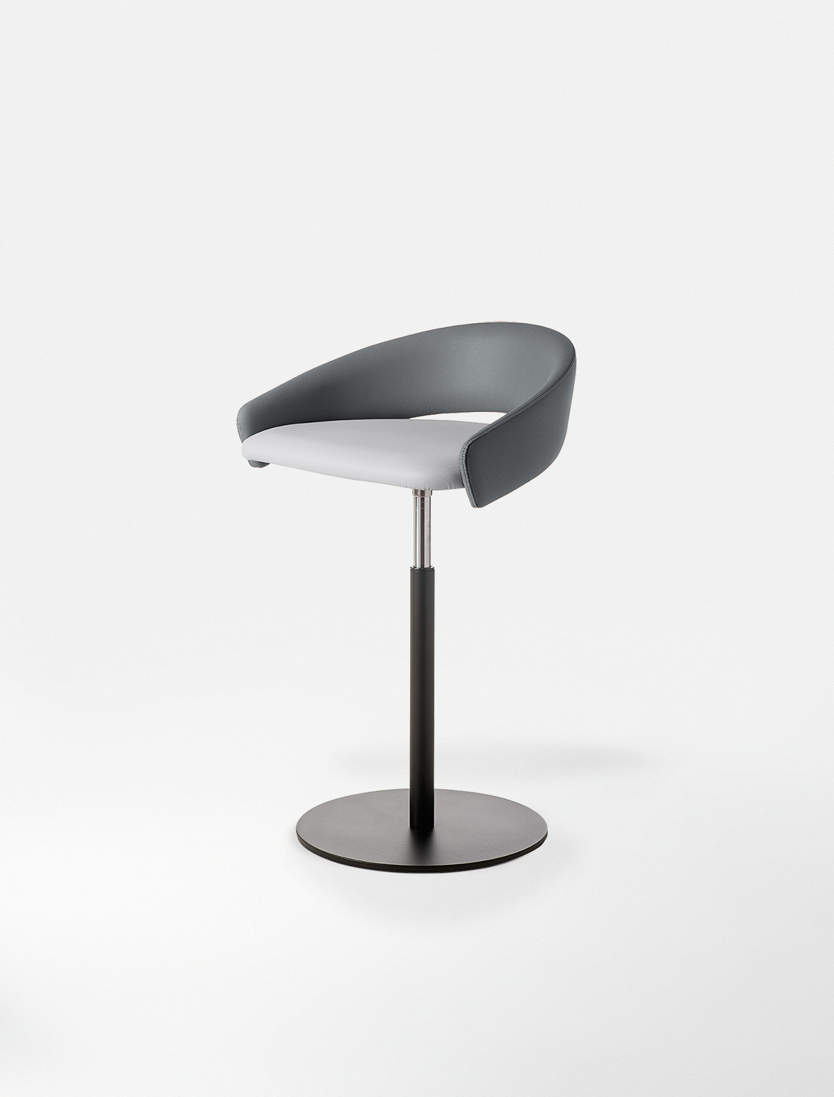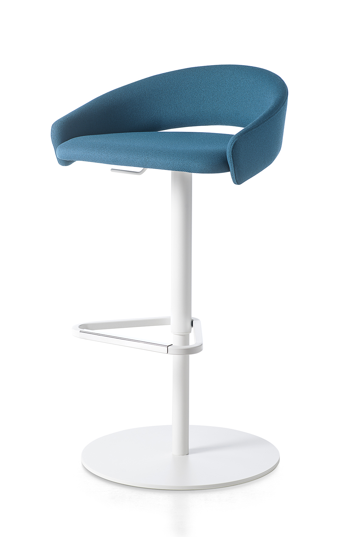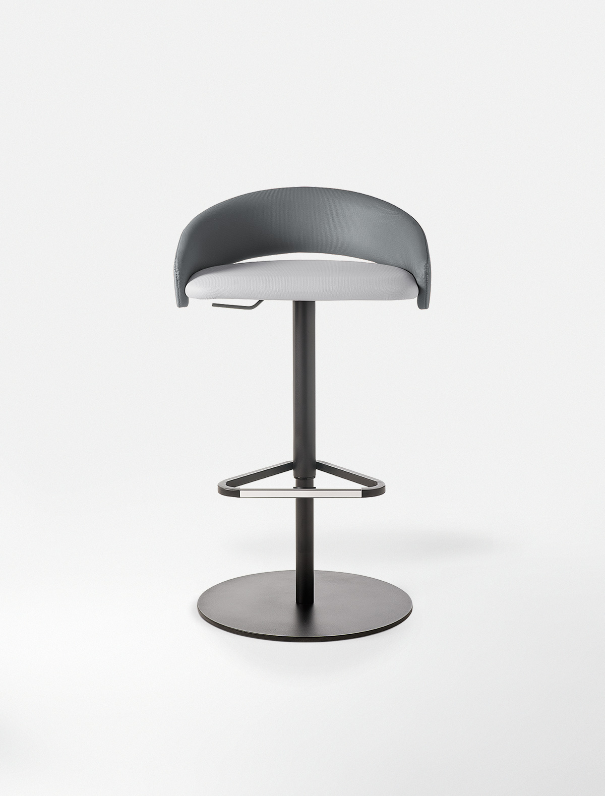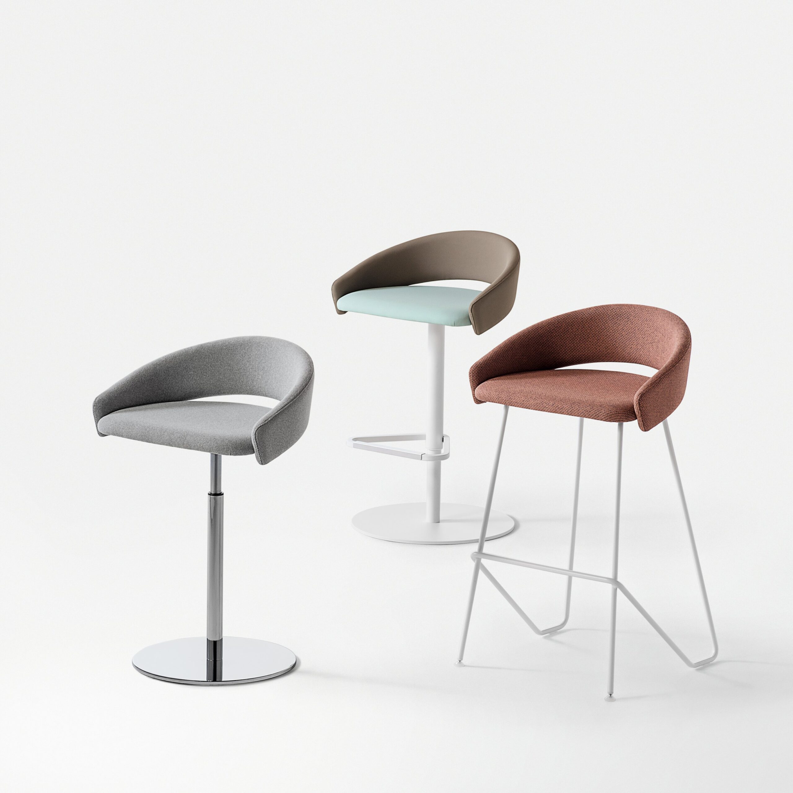 Lo sgabello con sedile e schienale rivestito Kimmi è disponibile nelle versioni a telaio fisso, con base piana girevole, con base piana girevole e appoggiapiedi. Kimmi è proposto monocolore o bicolore, per valorizzare e personalizzare il tuo ambiente come più ti piace.
