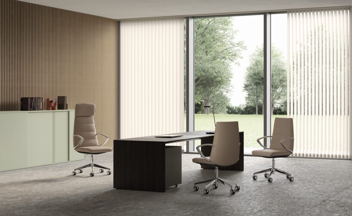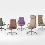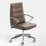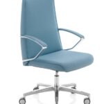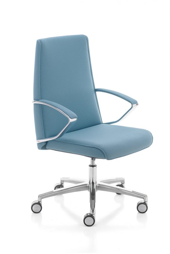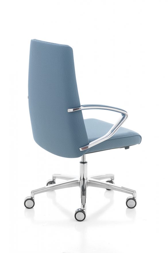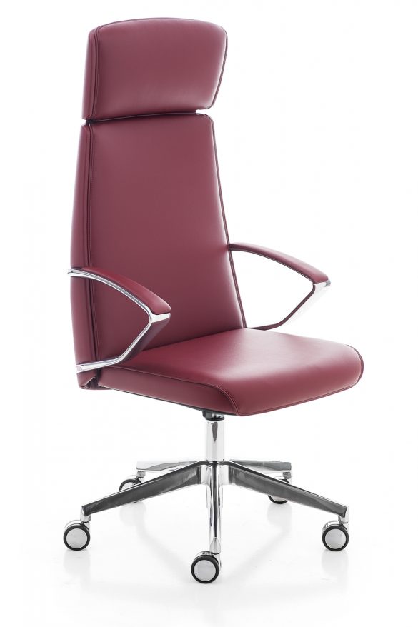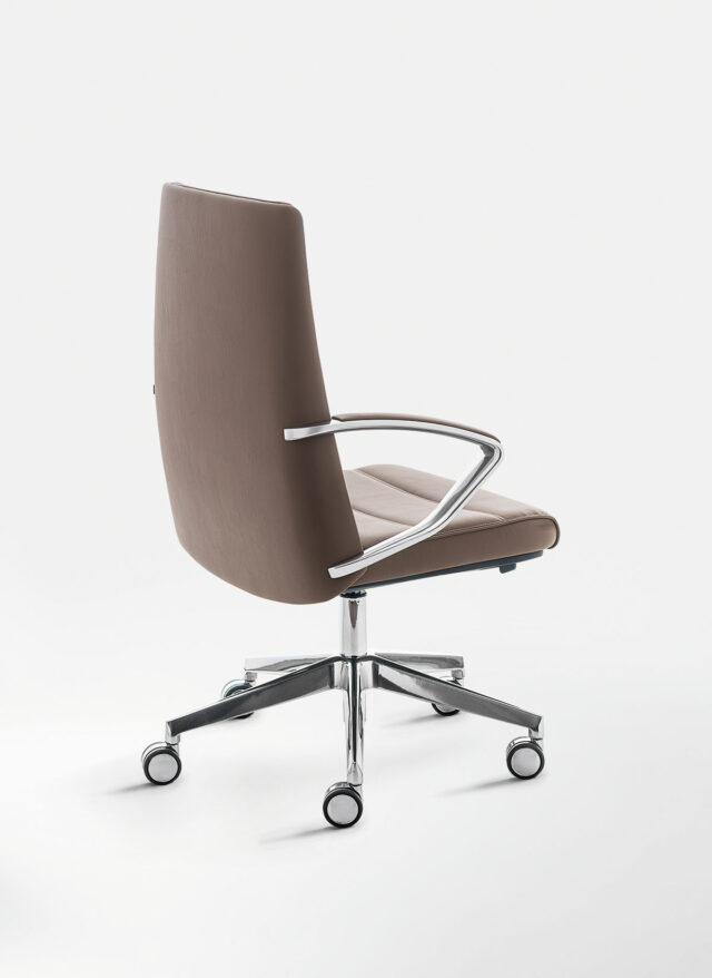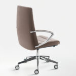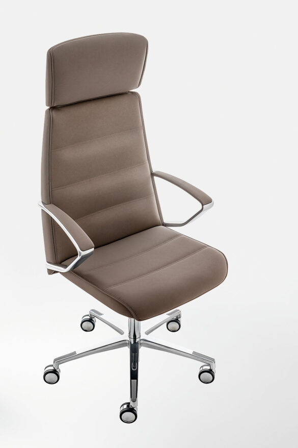 La poltrona direzionale imbottita Klivia è disponibile con schienale alto e medio, nelle versioni con imbottitura liscia o con cuciture lineari. Dotata di meccanismo syncron autoregolante incorporato nel sedile e braccioli in alluminio lucido e imbottiti.