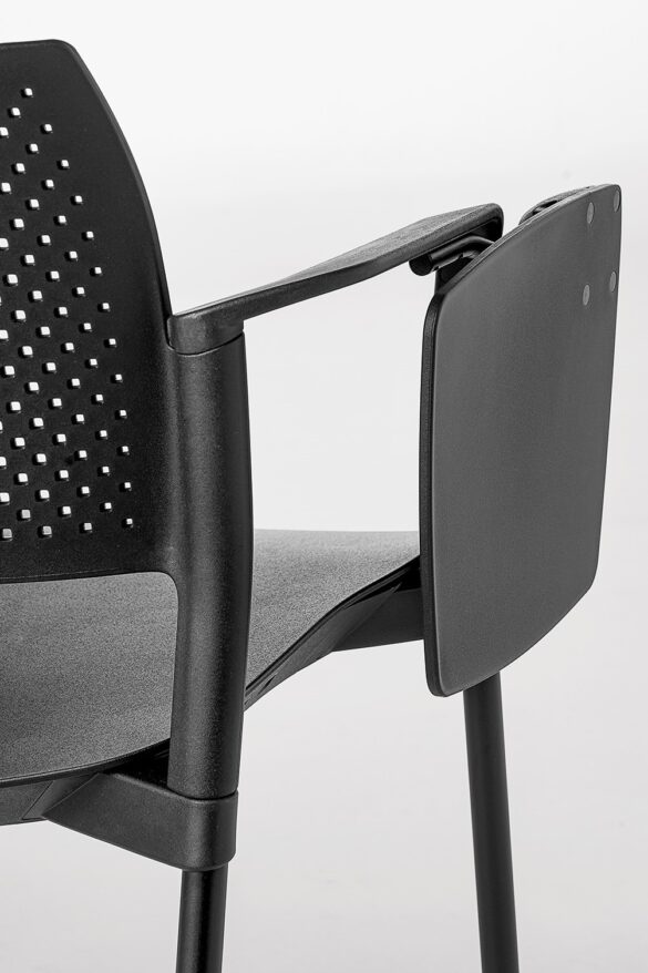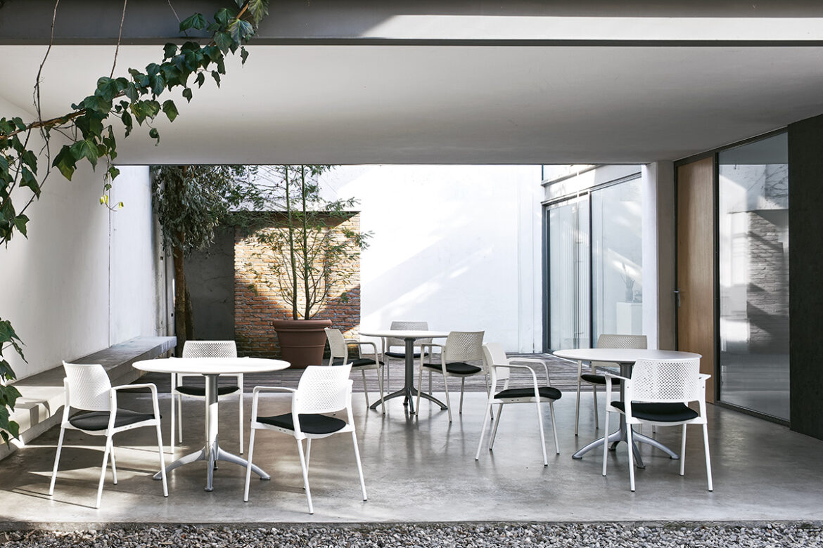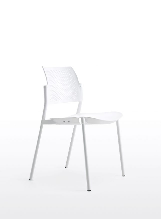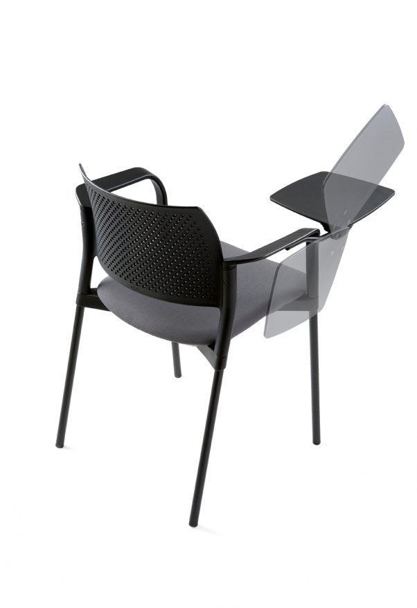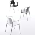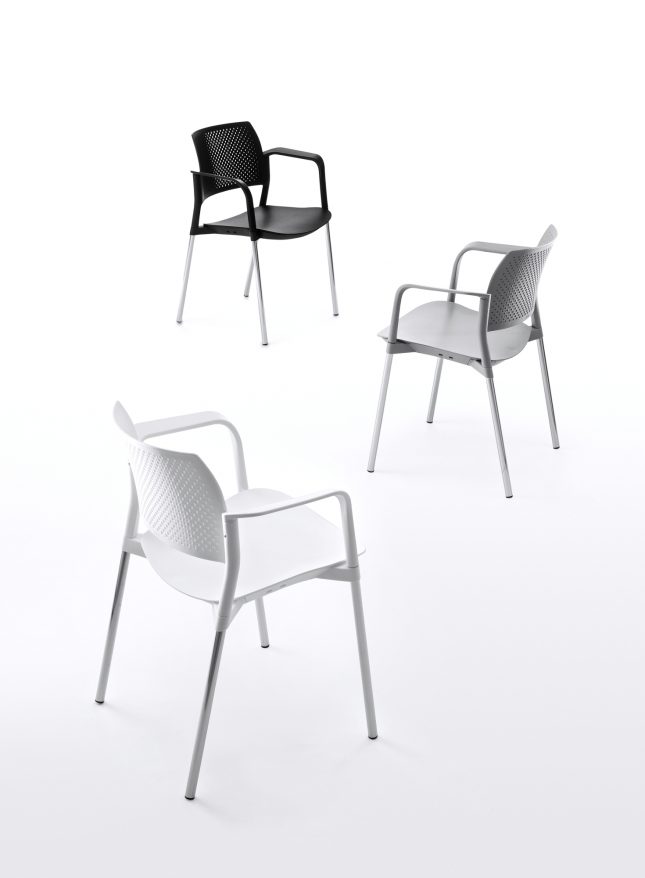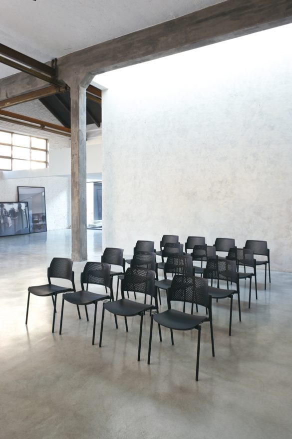 La sedia impilabile e agganciabile Kyos è disponibile con telaio 4-gambe o slitta, con o senza braccioli, nella versione in polipropilene bianco, nero e grigio, può essere sia con sedile imbottito che con sedile e schienale imbottito ed è ideale per conferenze e riunioni di piccole e grandi dimensioni. Disponibile anche nelle versioni con tavoletta scrittoio, telaio con ruote.