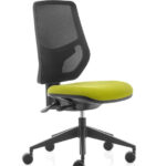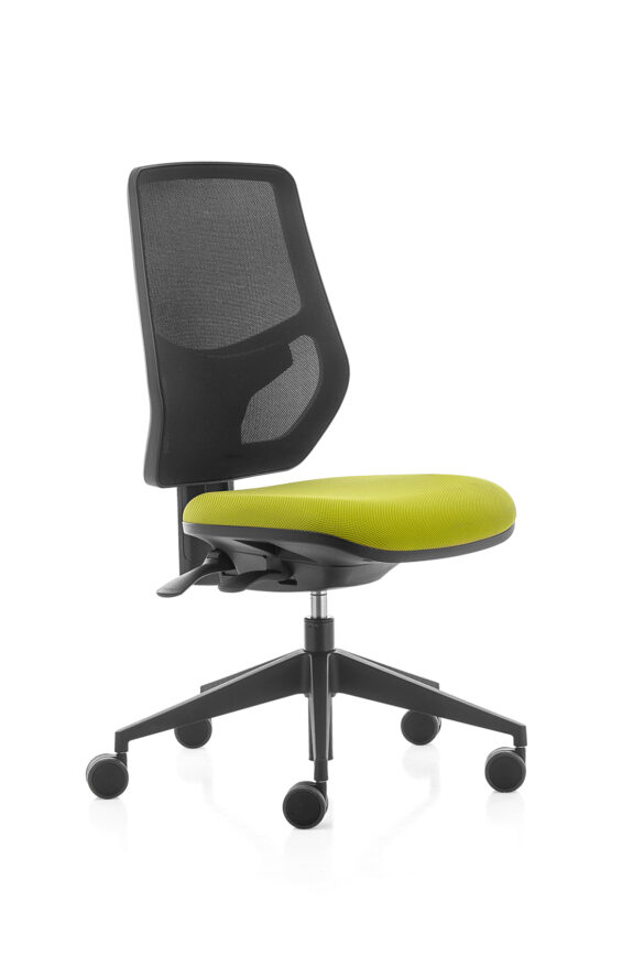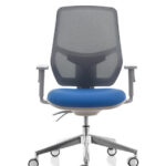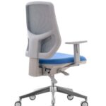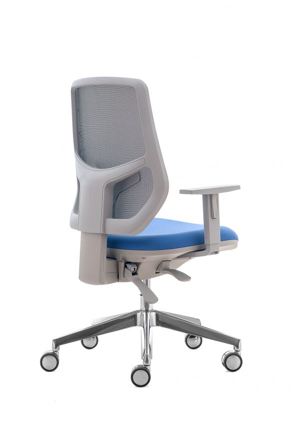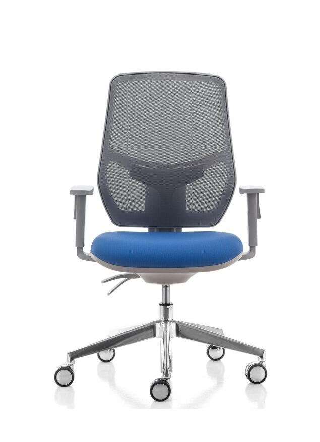 La poltrona operativa Kyton è disponibile con schienale in rete, nero o grigio, regolabile in altezza e reclinabile, appoggio lombare e braccioli regolabili.