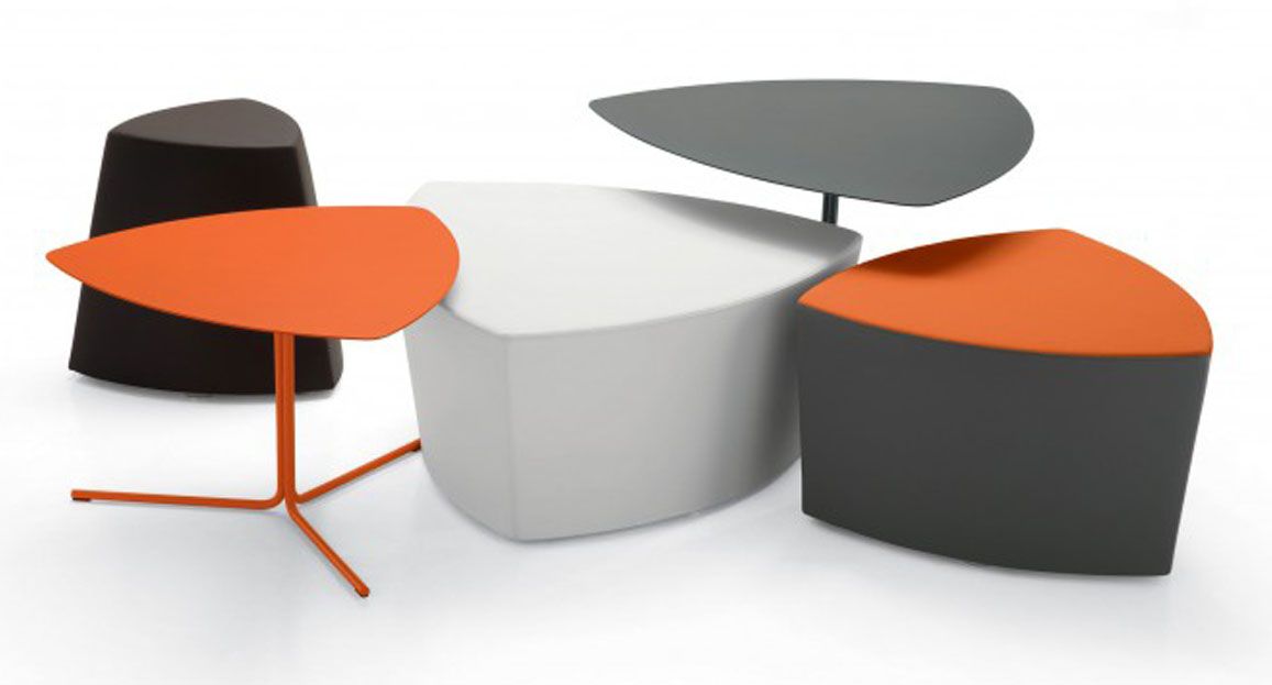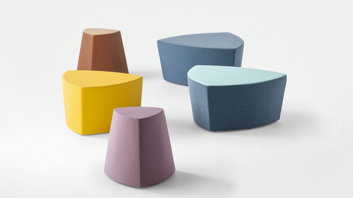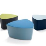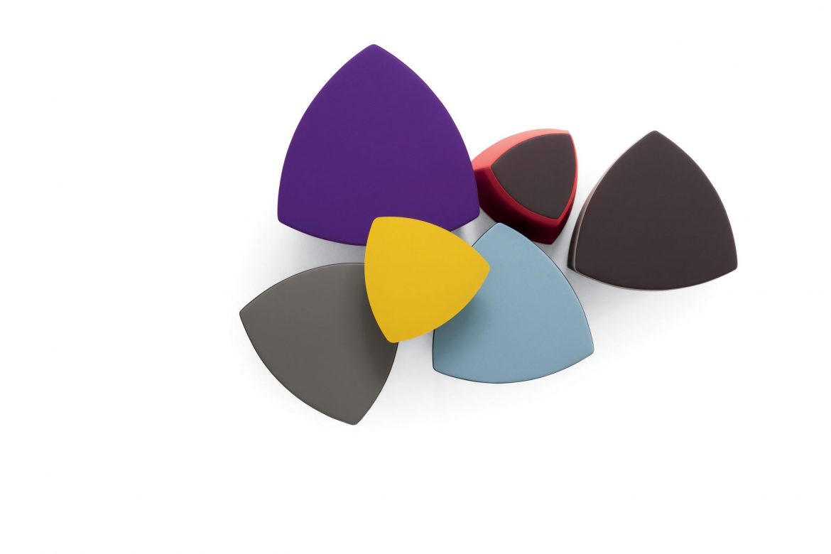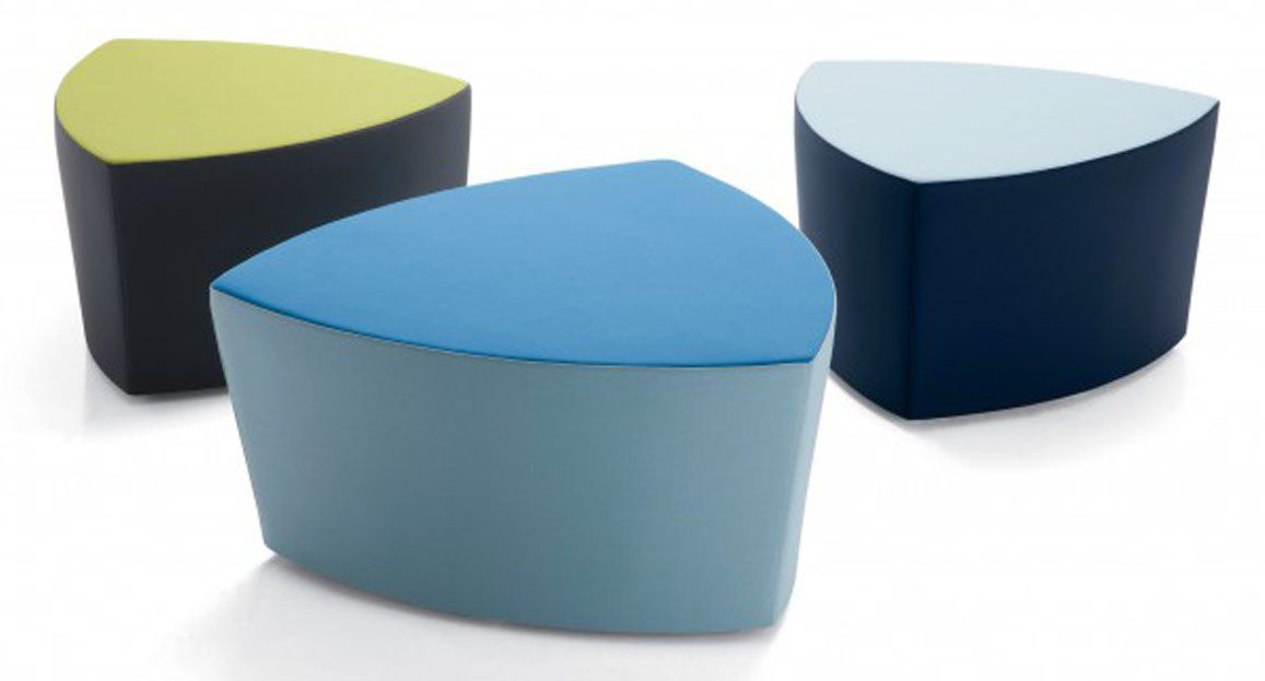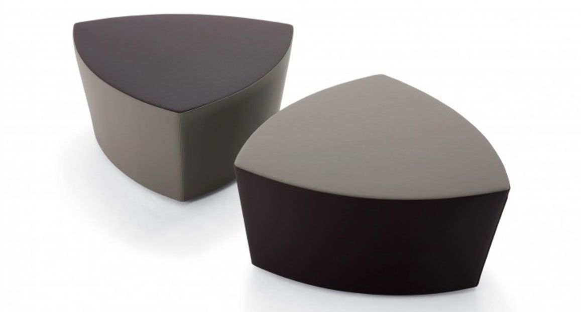 Il pouf di forma triangolare arrotondata Kensho, design Franco Driusso, è disponibile in 3 dimensioni, con piedini o con ruote, con rivestimento monocolore o bicolore.