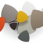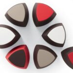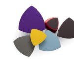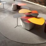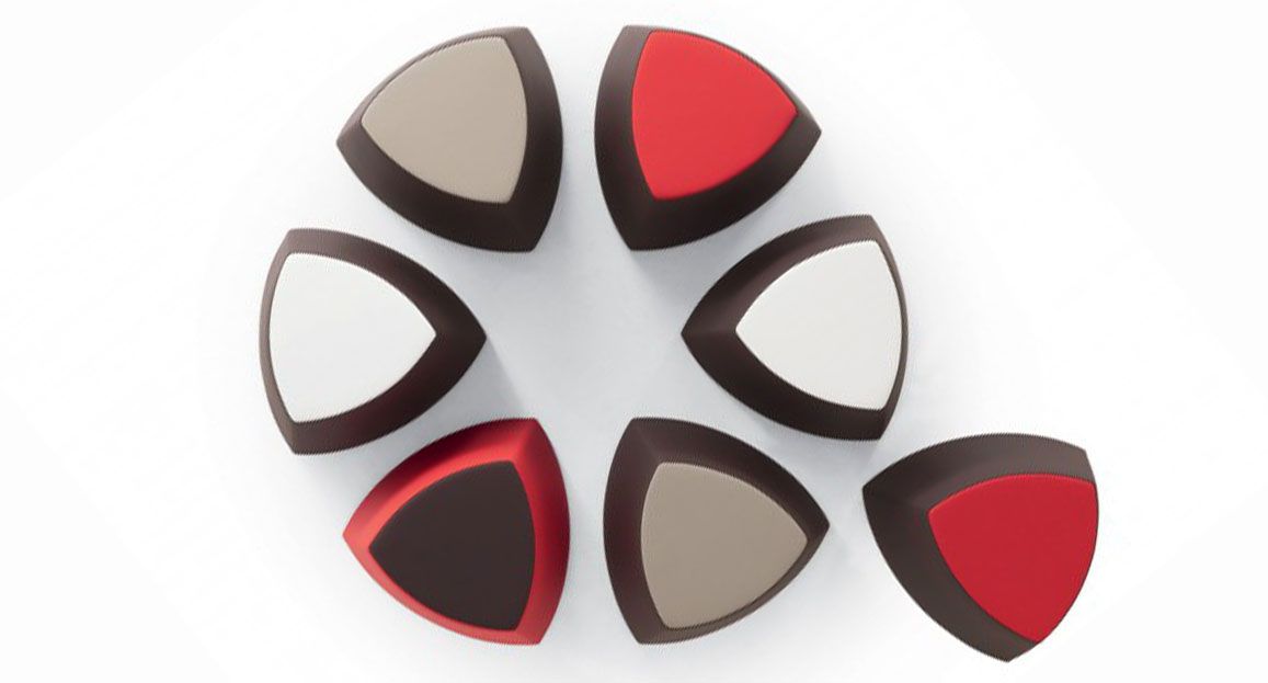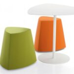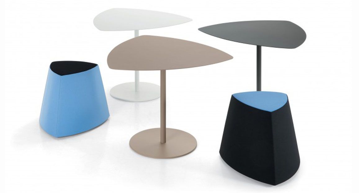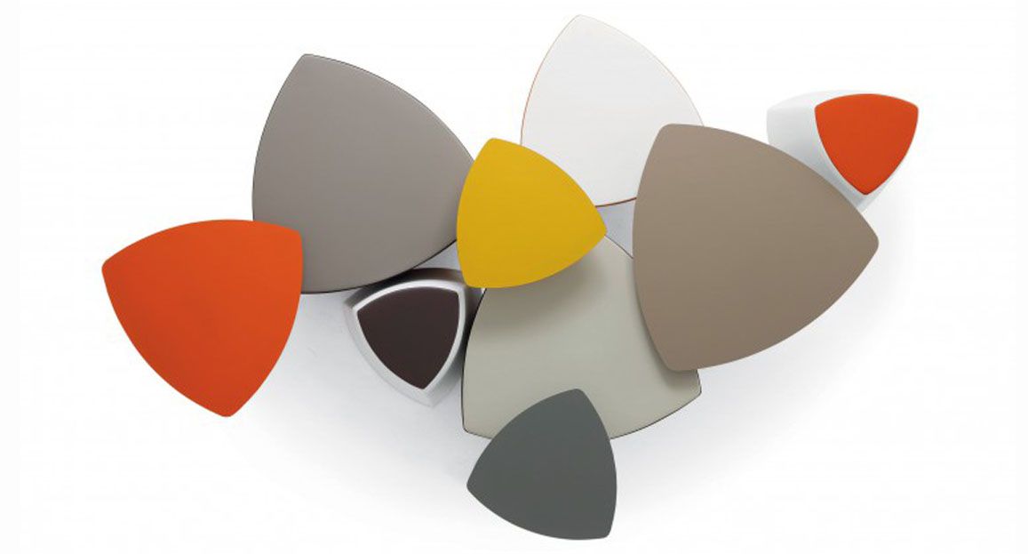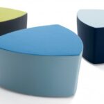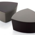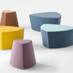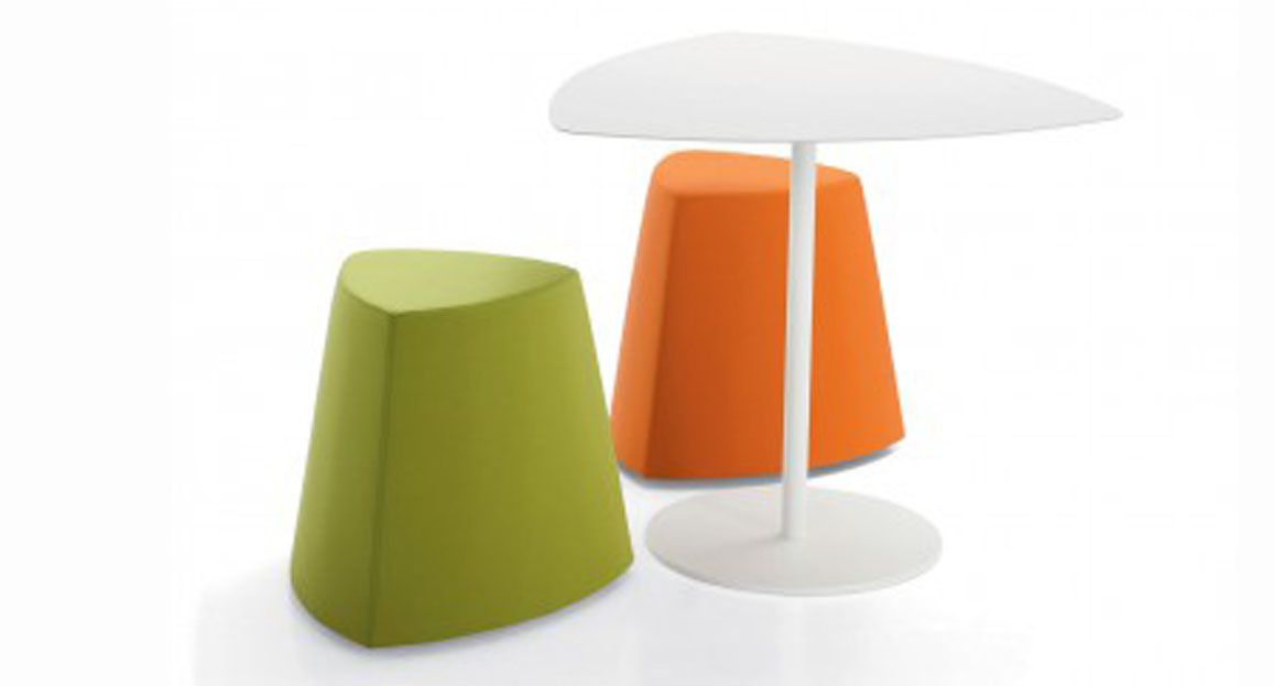 Il pouf di forma triangolare arrotondata Kensho, design Franco Driusso, è disponibile in 3 dimensioni, con piedini o con ruote, con rivestimento monocolore o bicolore.